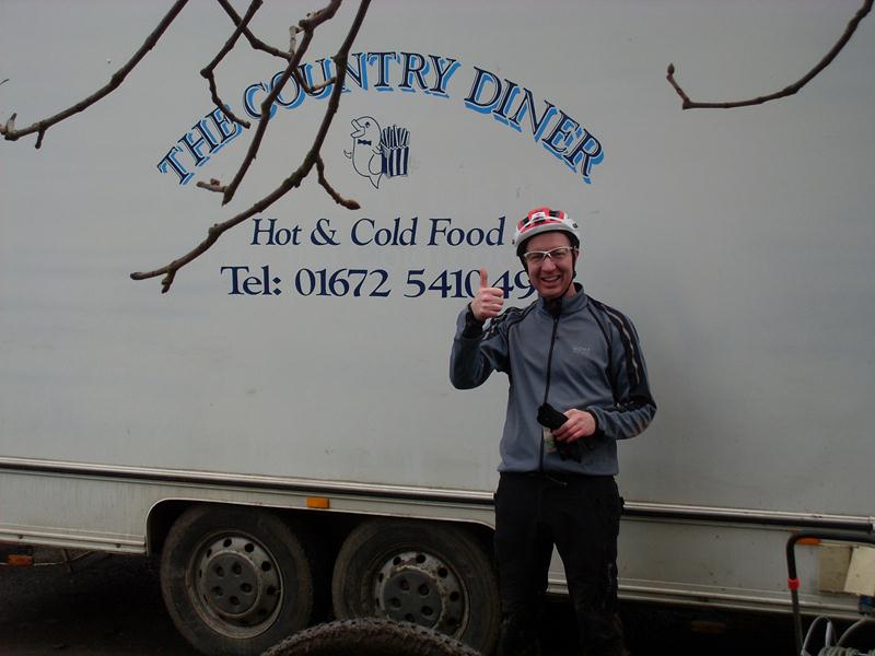 “We tootled down into the village to be met by a mirage, well a burger van actually that does most types of fast food, but on a cold damp day it was a welcome sight with hot drinks too. This works out well for a Saturday ride from Barbury castle as it’s exactly half way round (10.5 miles) and the van is there till lunch time. Apparently we ate him out of rolls, as he doesn’t normally have this many customers on a Saturday morning. I have made a note of the phone number in case we go that way again, I will pre warn him. Forward thinking so no-one has to go without. It’s not just a Mountain bike ride, it’s an MB Swindon organised ride!
