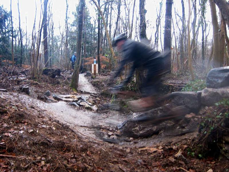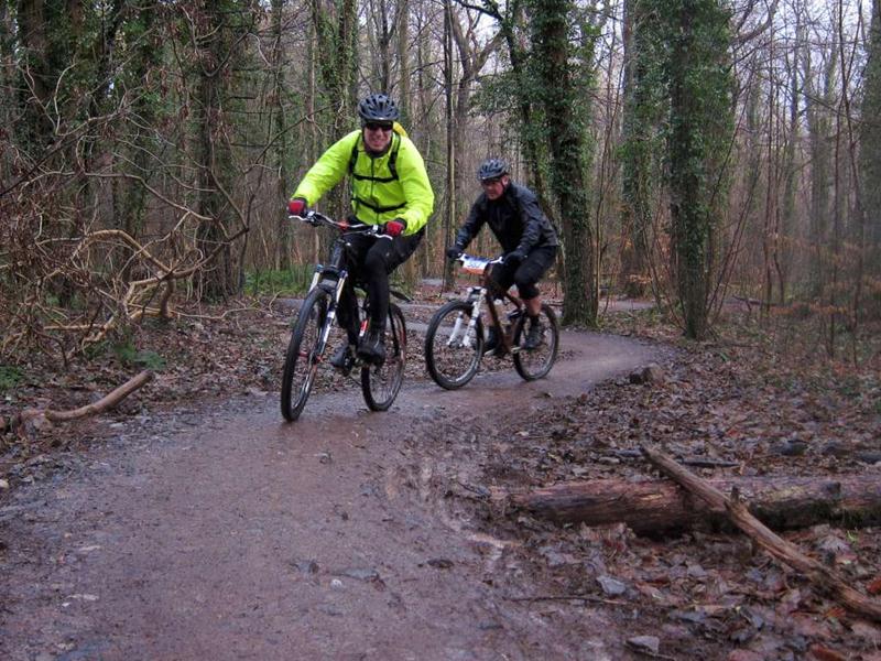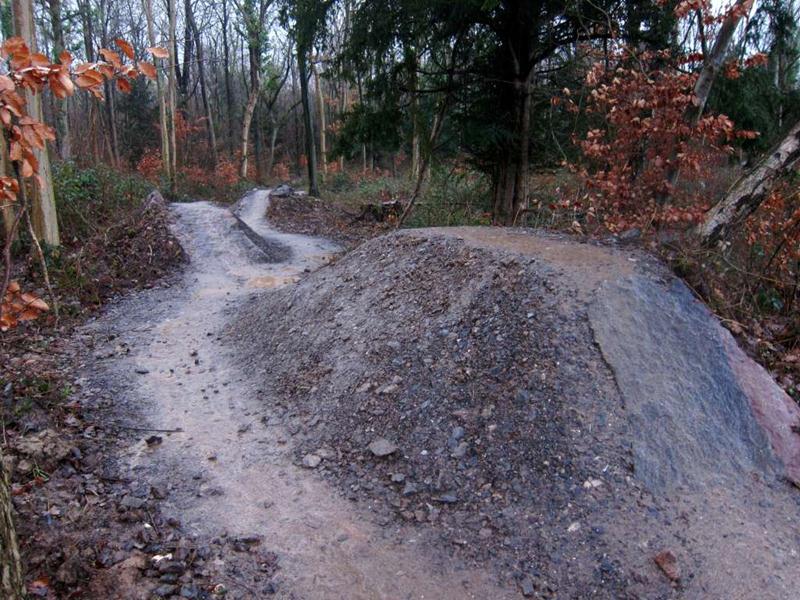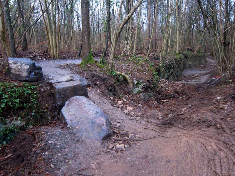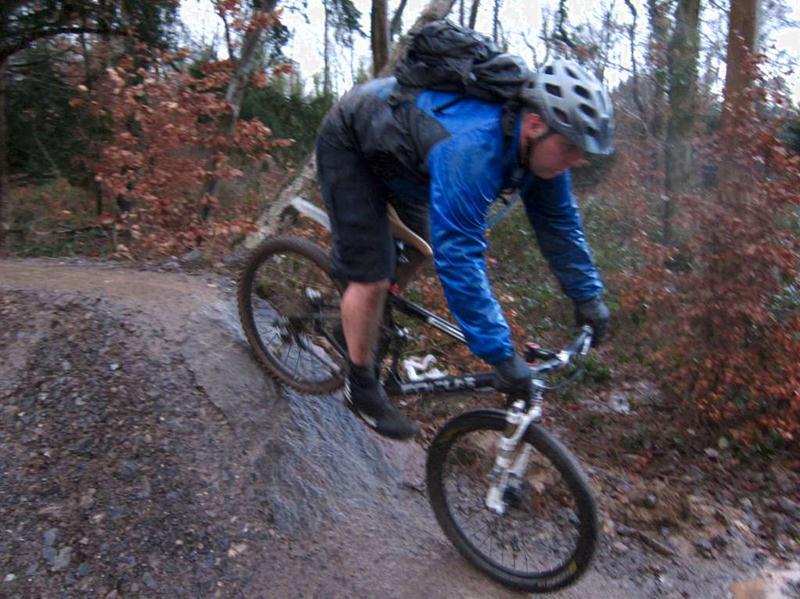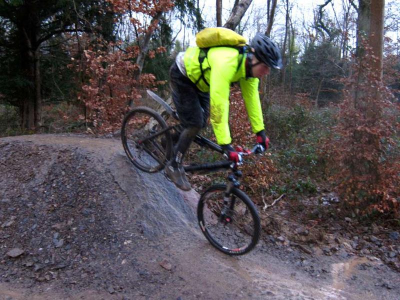 This was an unofficial ride at Ashton Court (we advertise these last minute rides on Facebook or twitter). See the ride report from October 2011 for more information about the main Nova trail loop including maps and video. We did a loop of the existing Nova trail and then tried out the new Yer Tiz trail. We liked the skills loop so we did that twice. Then we did the whole Yer Tis loop again. The red options add interest and the biggest drop off on the skills loop can make you think a bit. It rained and sleeted most of the time so we didn’t hang about taking too many photos. |