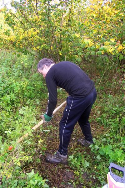 This was another early trail build day with just Phil and Tom present. We continued cutting out a route in the woods on the East side of the pitch. None of this was ever used – we went for a more direct line as a temporary measure and that was then adopted as the proper route. The tortuous route that we cut would have been next to useless to ride looking back. It was one the last parts of the trail to be surfaced, finally being done in December 2011! |