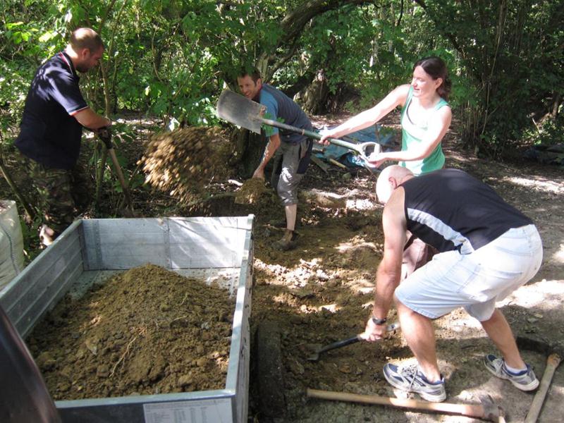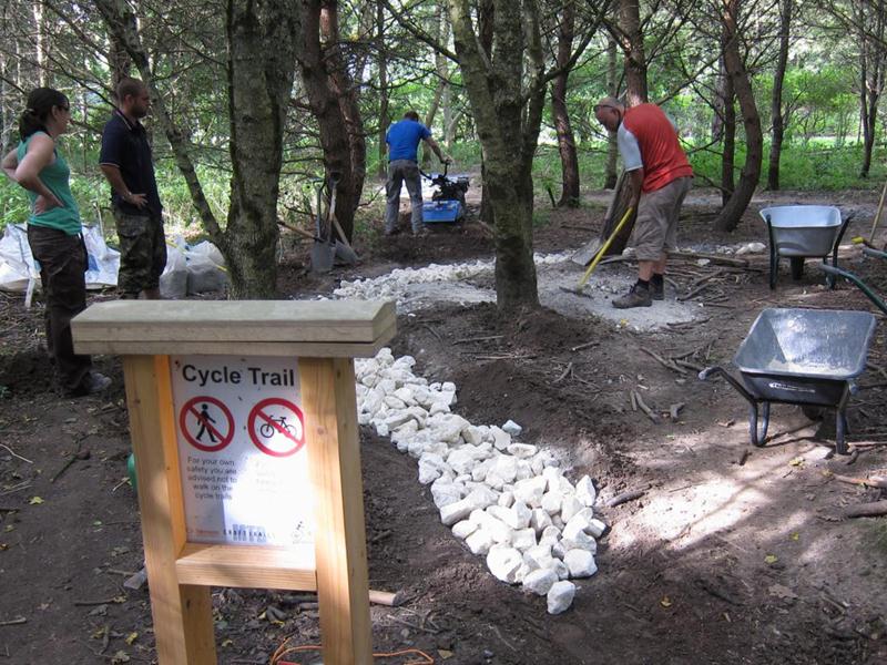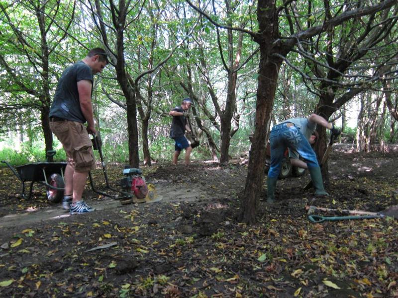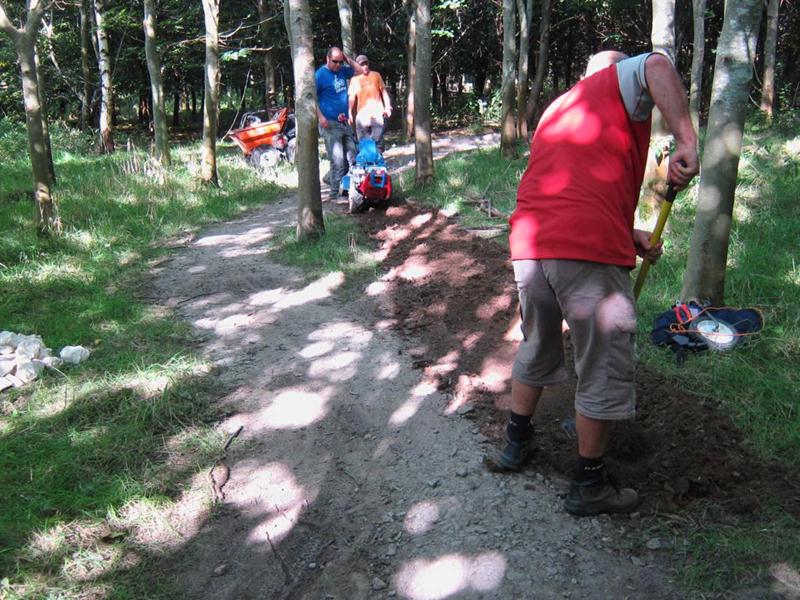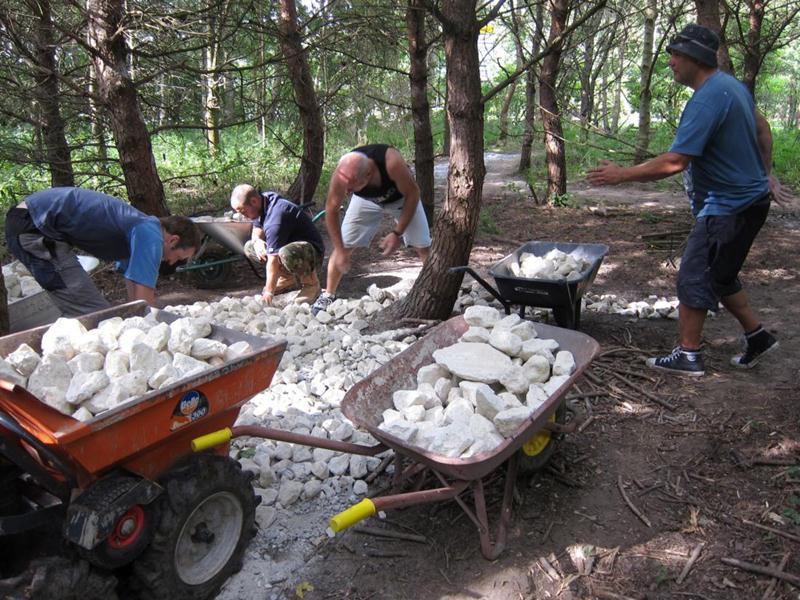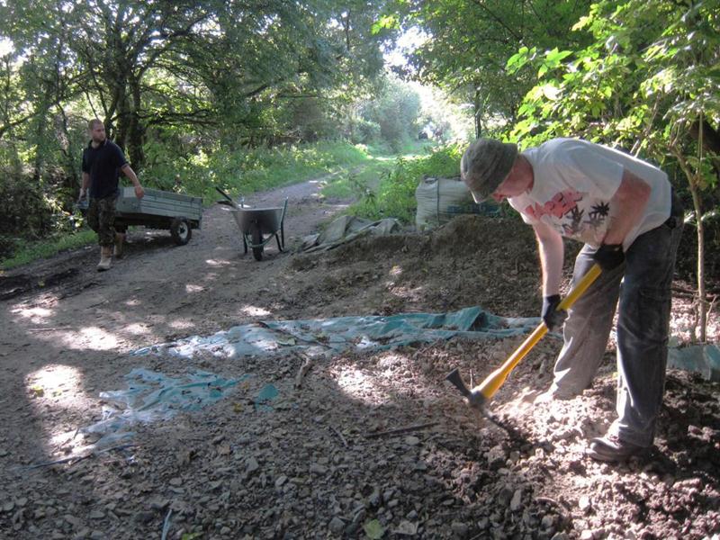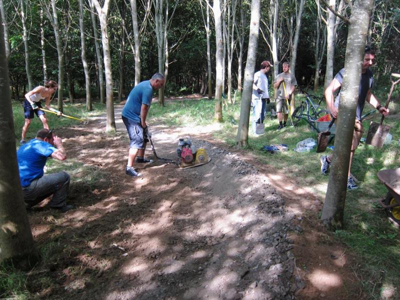By midday then there was no more work to do in the triangle so the groups moved to the north side of the pitch. A stock pile of rocks and chippings had been built up on the previous day. These were used to patch up the pot holes that developed over the wet summer. This was a section of trail dating back to 2008 and had received minimal surfacing. This section will be closed off at the next build weekend when it is properly resurfaced and rollers, kickers and berms are built.