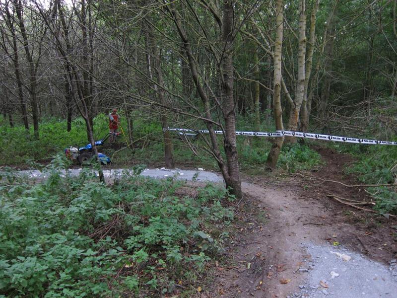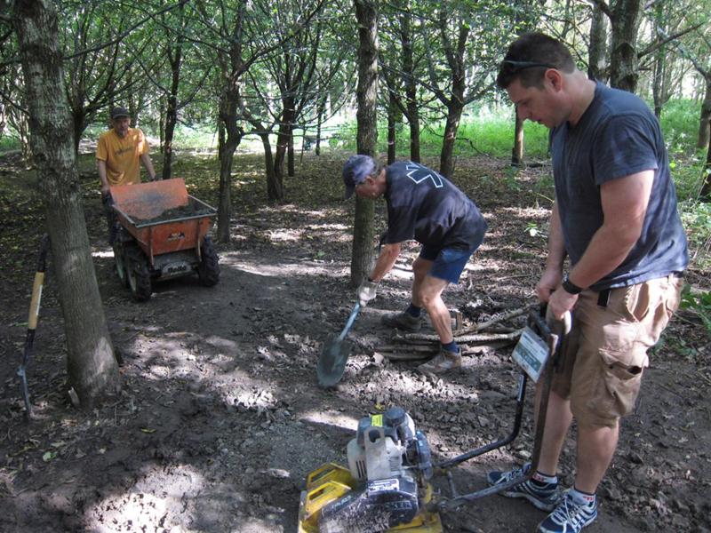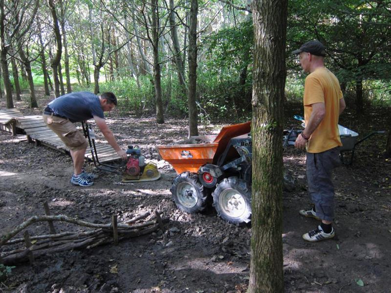 We set off for the triangle and split into two groups. One group concentrated on an adjustment to the trail and building some new berms. The other group dug up the remaining chippings from the old pile and used them to top up and widen various nearby sections: the end of the woodwork, after the last berm and the big pit after the exit ramp.