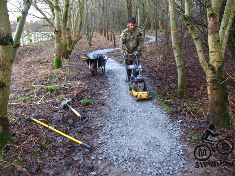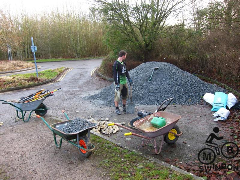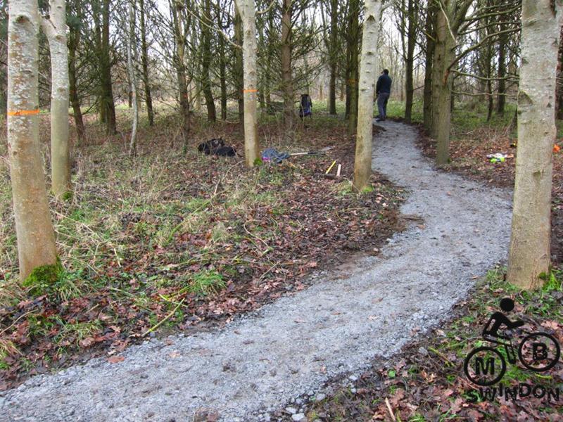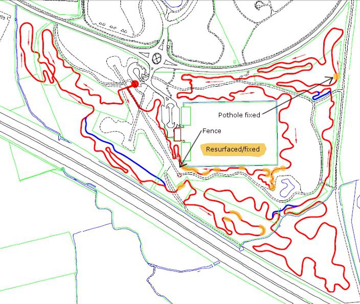 With that in the bag then attention moved to the trail on the south side of the pitch. This had been resurfaced in December 2011. The weather at the time led to it having a hard time straight away. So several pot holes and sunken parts had developed. These were fixed. The line was widened on the last corner. The exit section was completely refilled. Some small pot holes across the track were also fixed, originally surfaced in Jan 2011.
