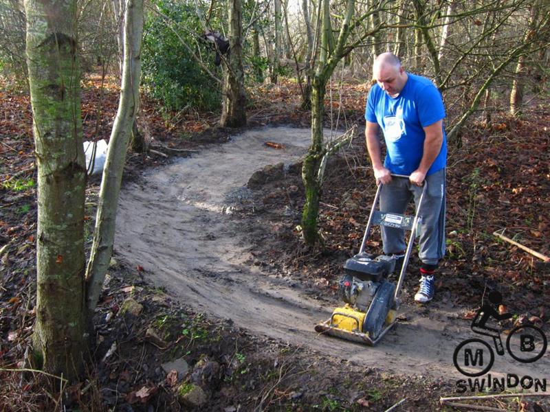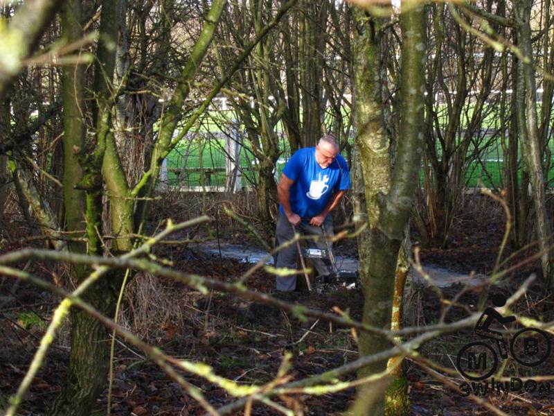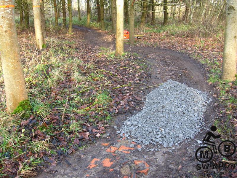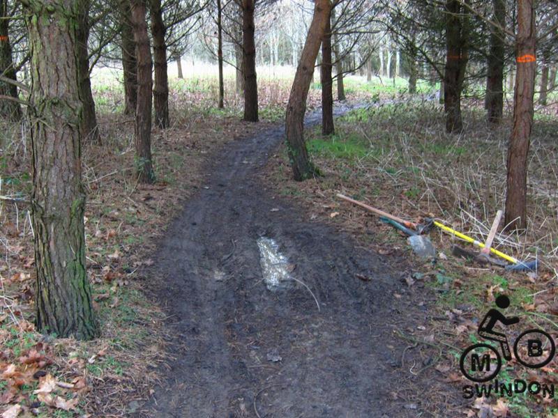 We started off by fixing up some deep potholes and mud on the large berm near the pond. Whilst we were there we fixed numerous small potholes in the surrounding area. This is actually a fairly old section: first dug in Oct 2008, some surfaced in Feb 2009, some more in Nov 2009 , a few uprated bits in March 2011 plus the berm and link in Dec 2011.