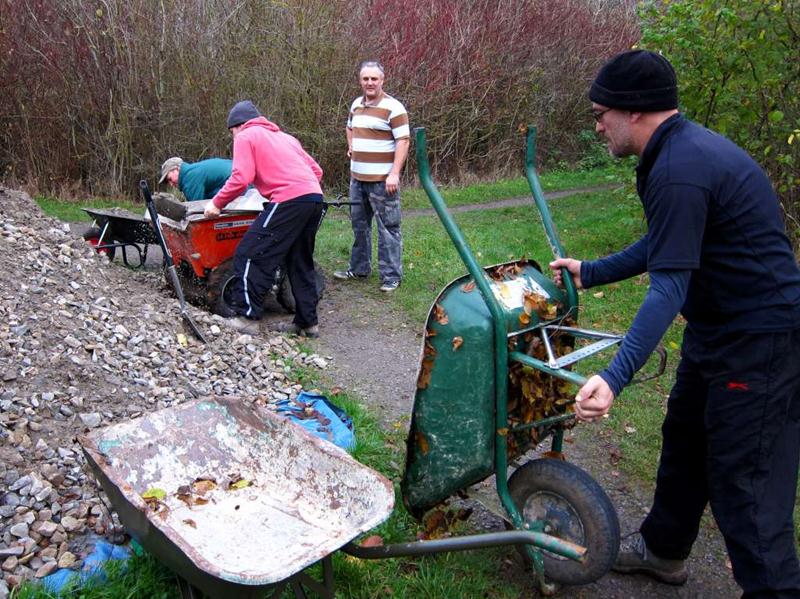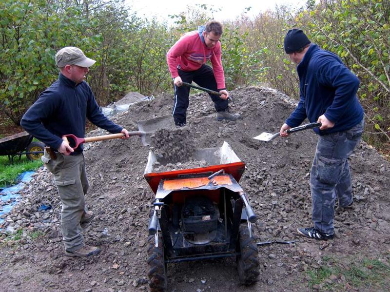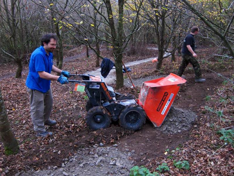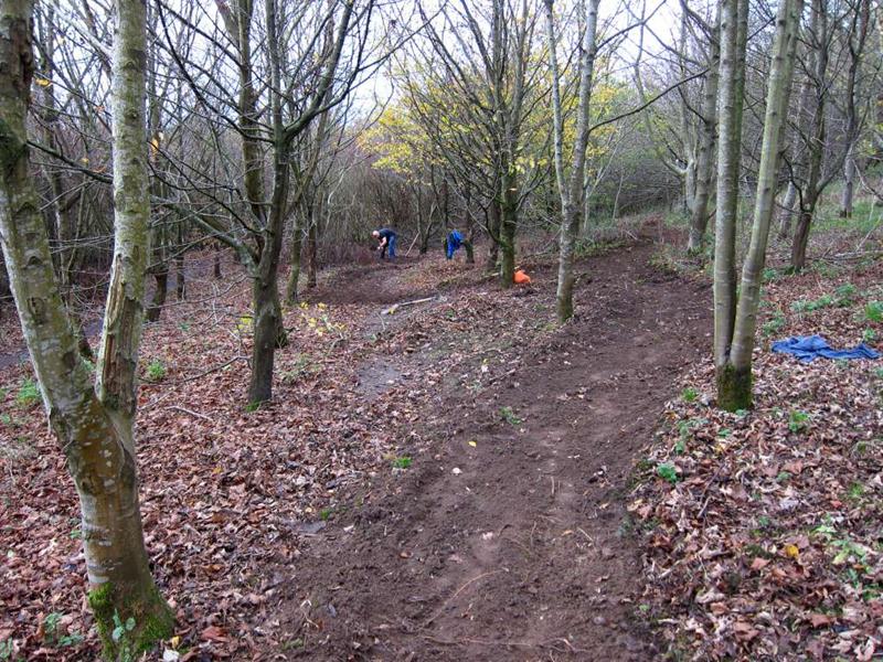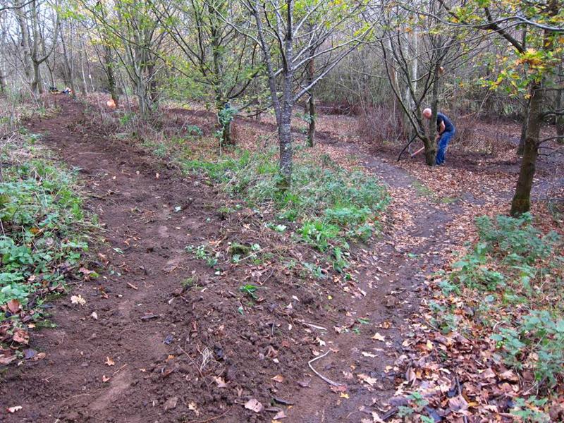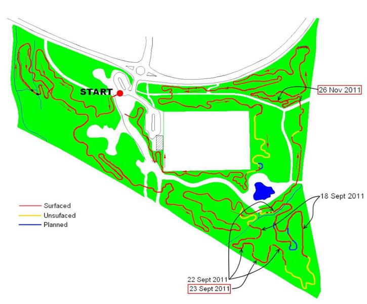 We had two targets for the weekend: surface the climb on Piper’s hill plus make a start on the last remaining mud section of the trail: the east side of the pitch. Piper’s hill had been dug out in April 2011 and survived really well as mud (see the build report from April). The onset of winter was threatening to turn it into a mud pit though. The east side of the pitch had been mud ever since we cut the route out in November 2008. On Piper’s hill we had a plan to make sure that Pete’s steps were a proper short cut. This involved digging a new line slightly higher up the hill from the top of the steps and then making the alternative route twist back onto. This gave the long cut two sharp corners plus a bit of extra length. Diagram showing layout before and after. The day started off quietly with just Tony la Porte and myself (Tom) on site. I busied myself cutting out the new line whilst Tony started on the east side of the pitch. A while later I was joined by Mike Jeffries and then Jerome. Chris arrived and then two more. With some serious gravel shifting fire power plus the power barrow we started filling in the Piper’s hill climb. Tony, Jez and Mike Jeffries dug out the whole of the east side (200m) by the end of the day. Piper’s hill was finished by the end of the day – we had another 100m of surfaced trail plus an improved layout. Thanks to everyone who turned up and made it happen. |