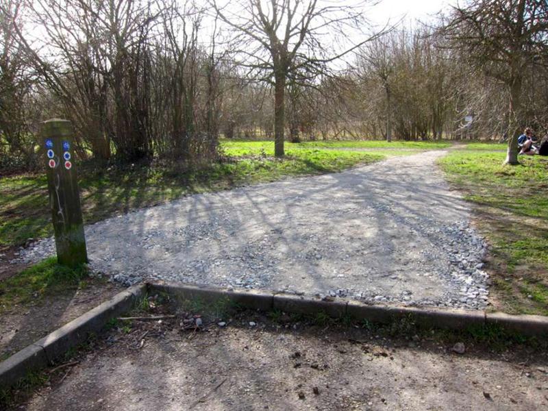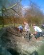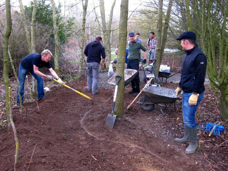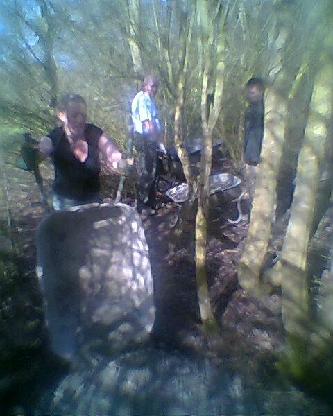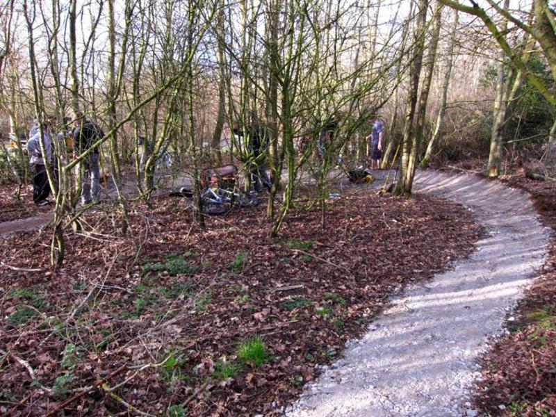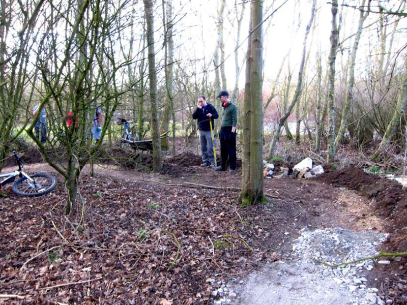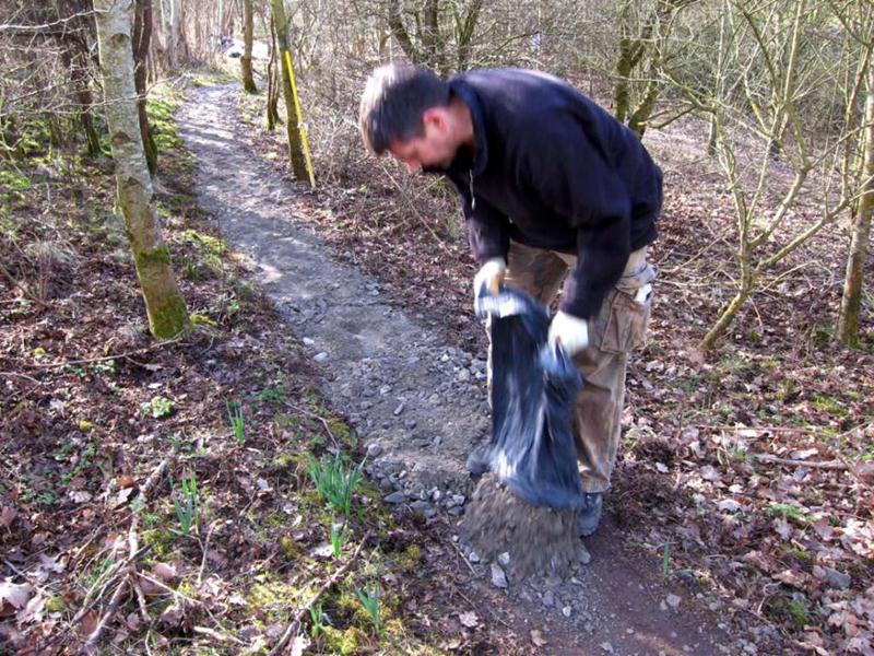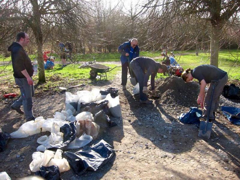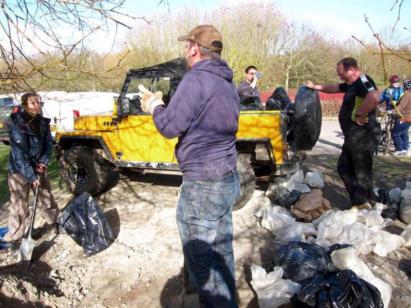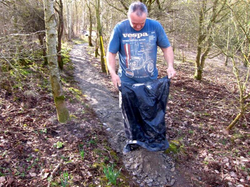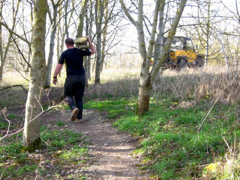 It was finally looking like spring on Saturday morning at 9am when Brandon Hire delivered the compactor (whacker). Jez brought the tools round and I kept myself entertained fixing the puncture on one of the wheel barrows and doing a quick recce of the gravel sack situation. The first trail build volunteer was Gary Palmer who arrived at 9:30am after spotting my gravel cam pictures on the Facebook group. We started on the job of bagging up the first of the 20 tonnes of limestone chippings from the pile. Next on site were Robin, Kristian, Pete Toop, Tony La Porte, Nigel Gregson and new recruit Tim. Rafe arrived at 10:30am with his Land Rover 11am update on Facebook: “It’s all happening now. Richard, Rafe and Chris are here too. I make that 12. Gravel being shifted. Bricks being shifted. Start path dug out.” When Gary and Sharon Yeates arrived then that gave us 14 people working on the trail. With this many people present then we were able do another job at the same time as filling sacks for the Land Rover. We dug out the path from the car park to the trail entrance. The mud was moved to the last section of trail where it was going to be used to build a berm. The Land Rover crew filled a massive (2 x 2m) Hippo sack with gravel at the triangle entrance and brought bricks back to be used in the new berm. Cunning. |