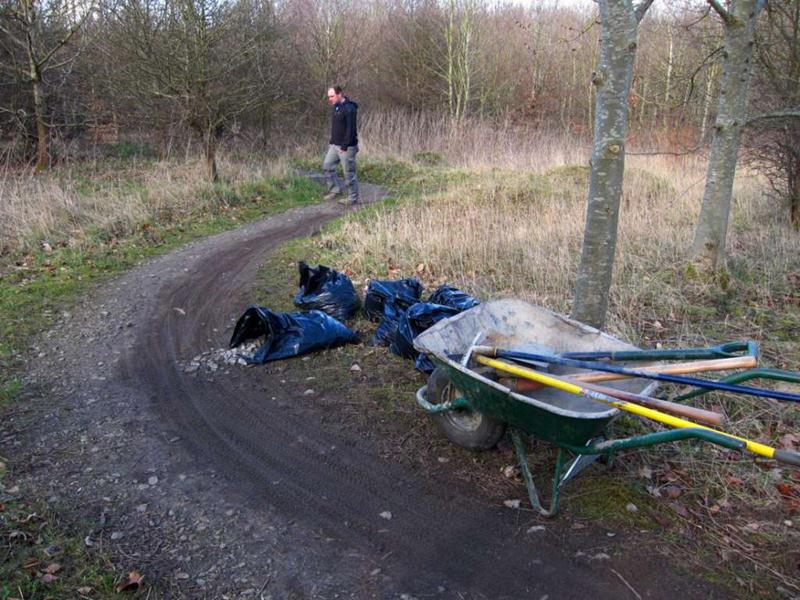 The trail on the west side from the tennis courts down to the trail exit was resurfaced plus the exit was extended by a few more metres. This trail had been built in 2008! The Land Rover crew then moved to a second Hippo bag down near the motorway whilst the local crew fixed a few minor muddy areas near the start of the trail. By 11am the 20 tonne pile was at less than half its original size. An amazing result. Facebook update from 11am “Start path done. Bricks and mud for berm moved. Land rover shifting material. Hand filling west side with 6 barrows.” The Land Rover crew now switched attention to Piper’s Hill where they built a stash of sacks to allow the line from the first rock garden to be fixed, resurfaced the following alley and then resurfaced the climb from the switch back. They also collected stray bricks for use in the new berm. |