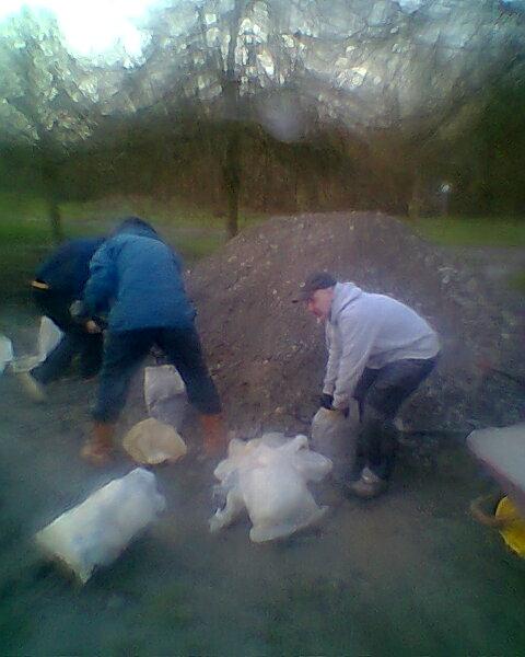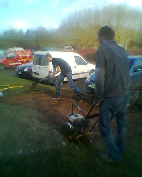 As evening drew closer then one team resurfaced the back straight near the start using a large pile of sacks from the previous build weekend. Meanwhile the other team tidied up the verge in the car park. |