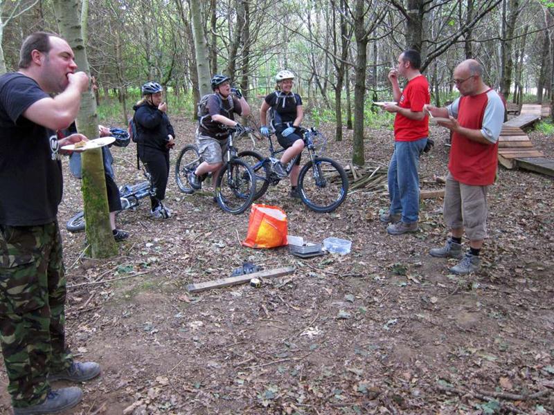 Next build day is Saturday 22nd October! See previous build reports: June – Aug, Sat 3rd Sept, Wed 8th Sept, Sat 10th Sept, Sat 17th Sept. The aim for the day was to move as much gravel as possible. Phil and myself (Tom) arrived a few hours early and spent the time marking out two big berms. We were soon joined by Tony La Porte and Jason and a while later by Pete Ratcliffe, Lee Wright and Nigel Gregson. Robin Steward was passing on his bike and lent a hand for an hour too. The group moved a lot of material and special mention must go to Nigel and Lee who both put in several hours of toil. Later in the day Pete Ratcliffe and Gary Lee moved a lot of gravel using the Land Rover. The last berm before the exit bridge had a lot of concrete slabs dumped into the base before being built back up with mud. We were visited by several women who’d just finished their ladies ride. By the end of the day we had 300 metres of trail with gravel tipped on it, two new berms, some rollers and around 25 tonnes less material on our pile. Our stats from 2010 showed that we were using around 70kg per metre of trail. We’re building wider and deeper now, using more like 100Kg/m which is an increase of around 30-40%. Next build day is Saturday 22nd October! |