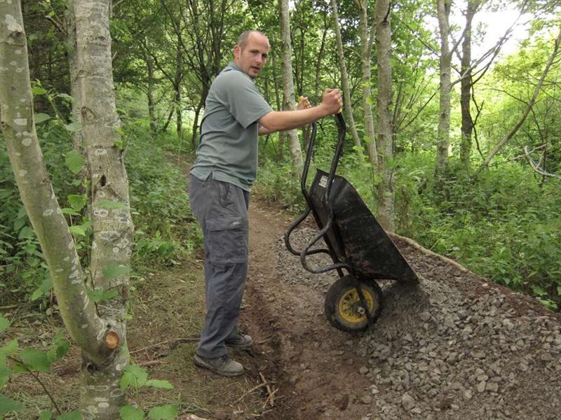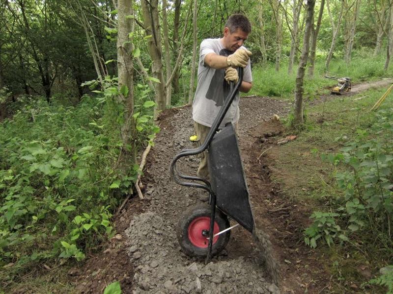 Surfacing moved down the hill to the big berm at the bottom but then we were a few metres short before connecting back to existing trail. We had to resort to a wheel barrow relay from the nearest pile of gravel which was miles away in the triangle. It was worth it to finish this section off.