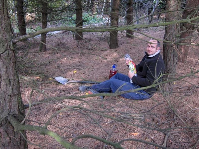We’d already shifted 20 Tonnes of limestone chippings on the previous day (photos and info). We had another 10 Tonnes of chippings and a lot of trail waiting to be dumped on. Things got off to a bit of quiet start after Chris had delivered the power barrow. It was like the old days with just Phil and myself there. I got on with shifting material with the power barrow whilst Phil fixed up some of the trail from the previous day. We found Andy Matthews eating lunch next to some trees and he joined us. James and his friend also arrived along with his father, David. |