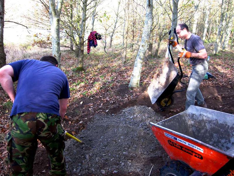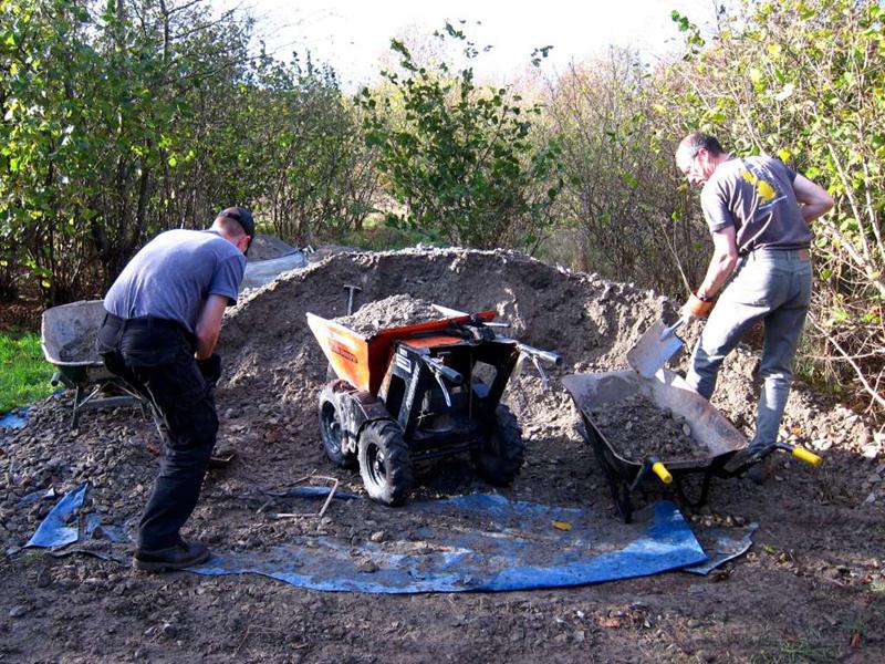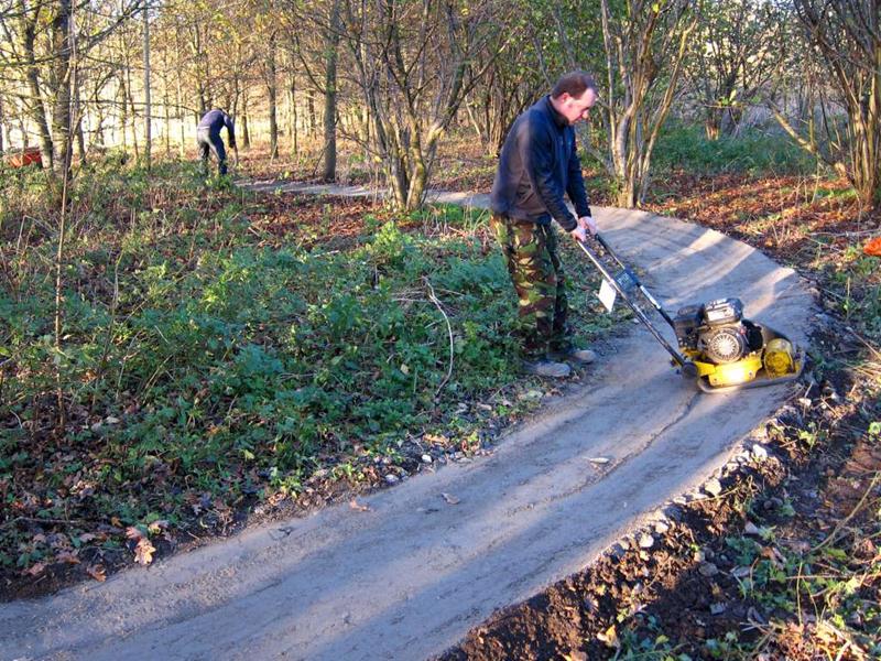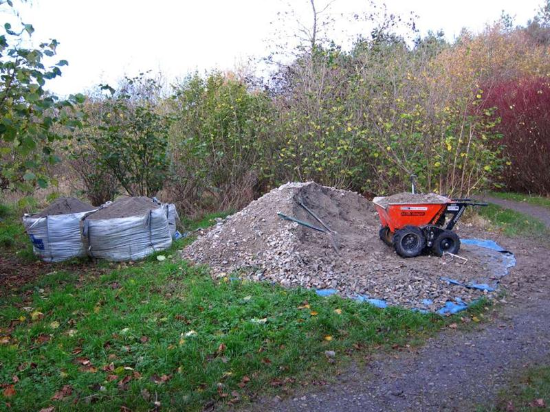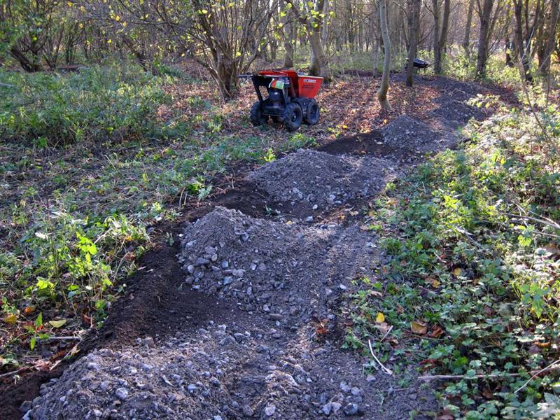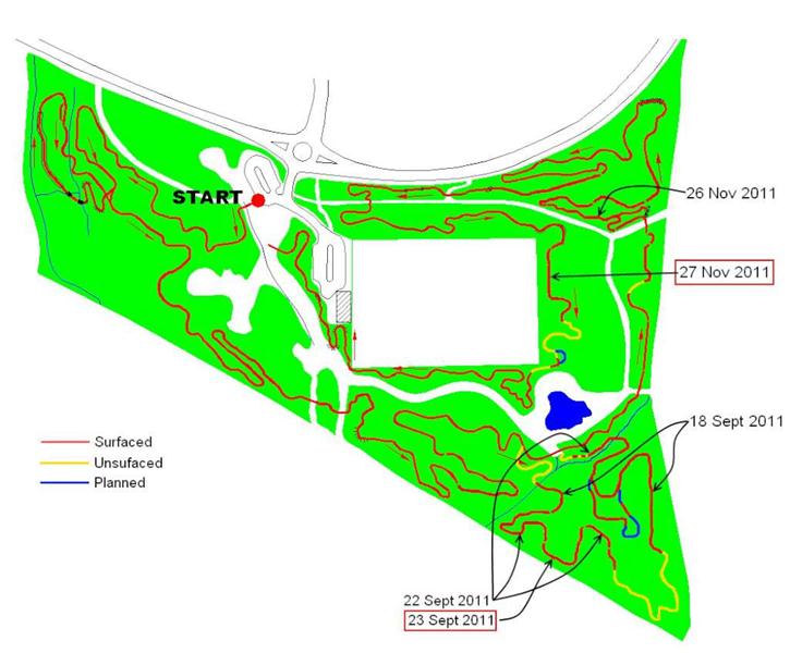 Following on from our progress on Saturday we were planning on filling in a load of trail on the east side of the pitch on this day. Phil and myself arrived at 8:30am in order to collect the power barrow from Jez and to get a head start on the east side. At 10am prompt then Kristian and Gary Smart arrived followed shortly by Julian Rodger. We shifted chippings using the power barrow plus two hand barrows. Phil was having trouble keeping up with the raking out. By 2:30pm Kristian, Gary and Jason were done for the day, leaving Phil and myself to catch up with the raking. We’d surfaced another 100m of trail. Just as enthusiasm was taking a bit of dip then Kat, Pete and Nigel arrived. Kat did a load of litter picking, something that we’ve been working on ever since we started on the trail. The rest of us finished off compacting and then dusted all 200m of new trail. We built up the first berm on the east side with bricks and a big pile od mud. Things are looking really good now – we’ve got 100m of trail waiting to be filled in with limestone chippings and then the whole trail will be surfaced. This will be a major milestone. It would be great to have a large turnout for this historic day on the 10th December 2011. |