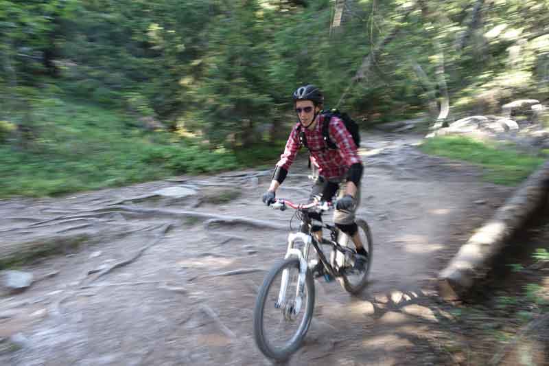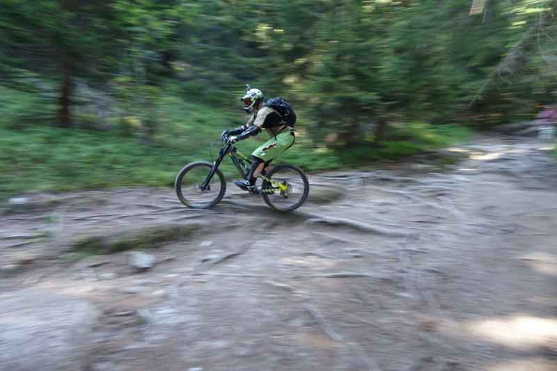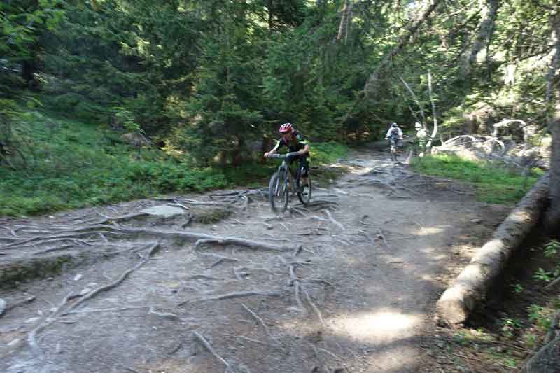 “Blair Switch Project – we tend to ride this one only with smaller groups, and during late and early season only. It’s probably the toughest trail we guide on in Chamonix – as the name suggests it is full of switchbacks – some of which can only be cleared by the very best riders, and even they will need to use their finest trials skills to hop the bike around in places! We have only had 1 person clear every section of this hour-long descent – will you be the second? If you can clear the switchbacks you’ll be confronted with sections such as “The Root of All Evil” which is several hundred yards where the entire trail surface is made of gnarled and twisted rootyness! It’s fine in the dry, but a whole different challenge in the wet…”