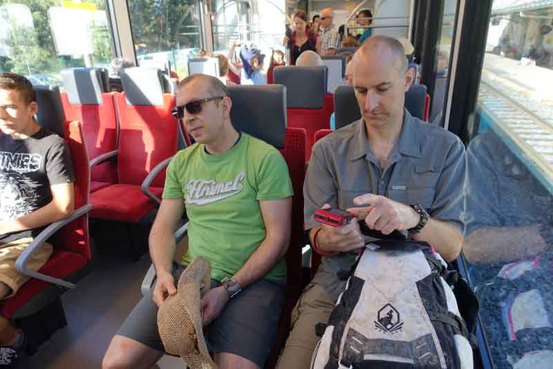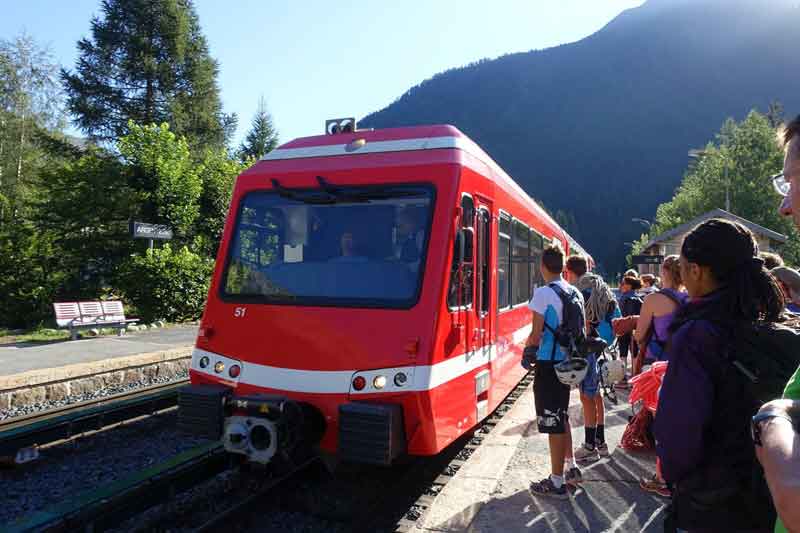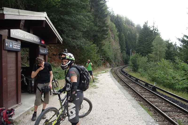 The ride to the train station has to be the best ever. Where else do you find a hidden train station only reachable at the end of a fast flowy section of trail? Yes trail, not footpath. OK, so it was more of a train stop than a station. It’s not much more than a bus shelter and a STOP button which you press to stop the train. The only clues it was there are the small SNCF signs from the road. Sadly, we missed the train by a few minutes. So back up to the road it was to be and it was a sprint back to Chamonix on the road. It was after about 2 miles into the sprint that I realized Schwalbe Magic Marys do not roll well on tarmac (tarmac in 35deg. C heat), even when paired with a Rock Razor on the back. Oh well, it’s not a race….Strava!