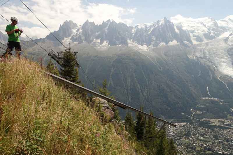 Border Patrol: we believe this trail is the ultimate Alpine riding experience and is utterly unmissable: it is our favourite trail anywhere! From the high point you will descend away from France into Switzerland on perfect singletrack through flower-filled meadows at over 2200m altitude. The trail begins fast and flowing on stereotypical Alpine singletrack, with huge views across the mountains. Upon diving into the treeline you will encounter dozens of tight switchbacks and occasional tricky technical sections infested with roots and rock gardens. After an hour or so of this incredible descent you reach the valley floor in Switzerland. A short ride sees us catch another lift back up to 2000m (where you have the option to descend the full height of the mountain again on a World Cup style DH trail before getting back on the lift to the top) to reach the col ready for a choice of final descents back into Chamonix 1000m below – all the while Mont Blanc towers above you…an incredible day for photos!