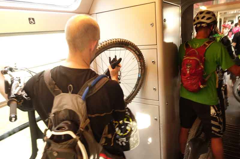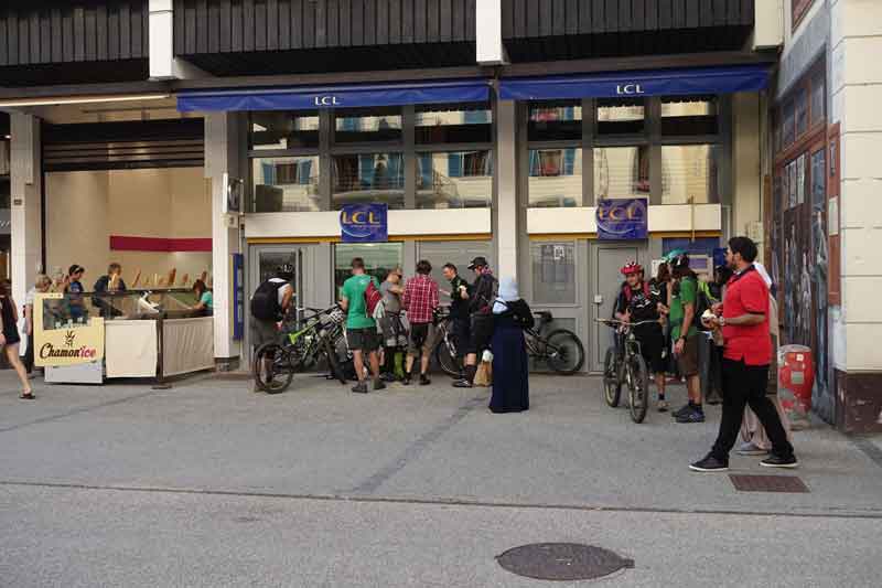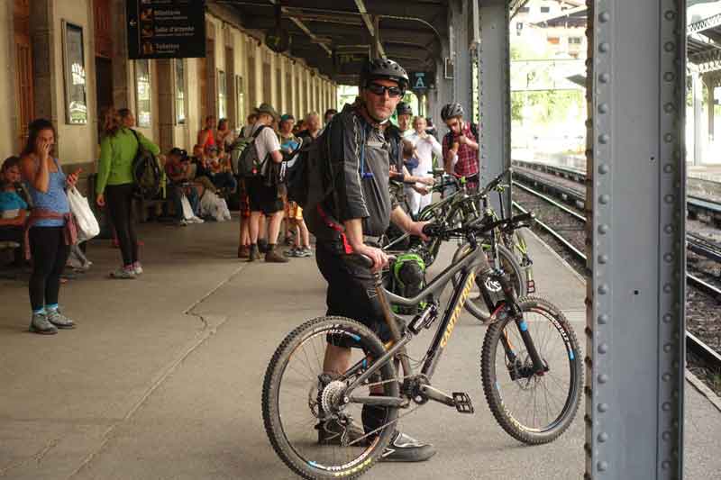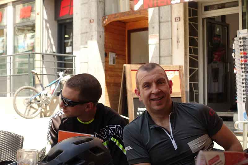 We reached Chamonix and visited Zero G bike shop so Richard could buy some spokes and nipples and a few of us had large ice creams. There was some drama when we tried to board the train at the main station and we had too many bikes. The guards didn’t like it and tried to get us off the train. Some of us eventually agreed to get off but it was another hour wait for the next one, so Mark and myself decided to ride back on the road back to Argentiere. Those sticky MMs! Mark was so chuffed that he beat me back to the Chalet.