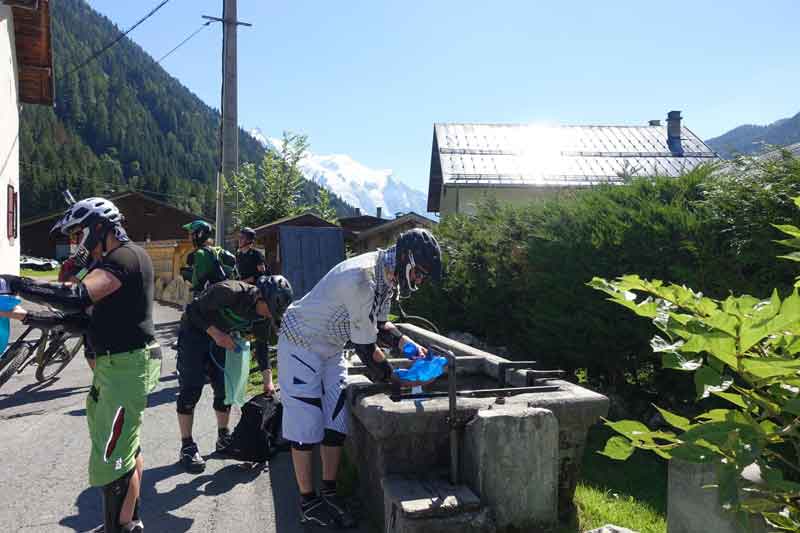 We rode up the road behind the chalet and headed towards the mountain. The first climb of the week and everyone was eager to prove their fitness. We noticed even after this short little technical climb that it was easy to be out of breath in the higher altitudes and combined with the heat it was going to be tough week. We continued and rode along fun bit of singletrack running back down following the contour of the valley towards Chamonix, stopping occasionally to regroup.