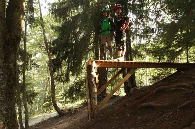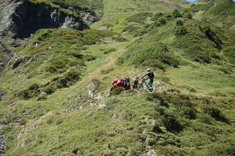 Menatour – A new addition in 2014, and is close to edging it as our favourite trail! This one starts out heading in the same direction as Border Patrol, but after the initial descent it heads more directly down to the Swiss border – and offers a very different set of challenges and scenery. Why is called “Menatour”? Well, firstly it heads through an area called “La Mena” – but more importantly, the further you descend the darker and more challenging it becomes… It all starts off lulling you into a false sense of security on perfect, flowing meadow trails high on the mountain…gradually the switchbacks appear and you head into the treeline. It’s a very deep, dark valley at this point…and to reach the bottom you have to clear “The Maze” – a final twisting set of switchbacks through dark woods on unusually rocky singletrack. It requires skill, confidence and control to clear this section successfully – especially in the wet! Will you come out of the Maze having successfully escaped the Menatour?