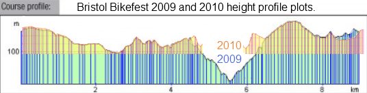 2009 and 2010 height profile maps overlayed, showing how the 2010 route is the same except for the big drop down into the valley.