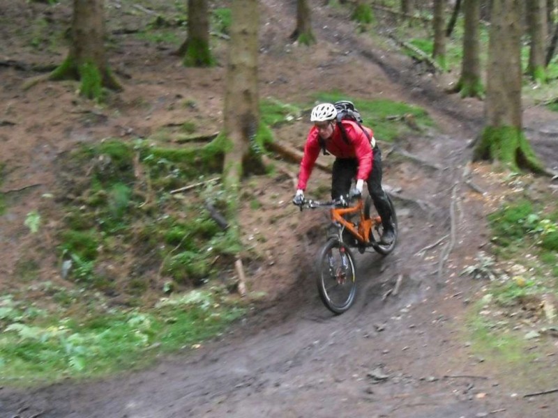 We did a few runs down the main Corkscrew downhill near the Pedalabikeaway trail centre. There is an uplift available (Flyupdownhill) but we didn’t use that; we rode up the hill. The route was wet and slippery but still a lot of fun. Video from 2008 showing typical bits of the downhill.