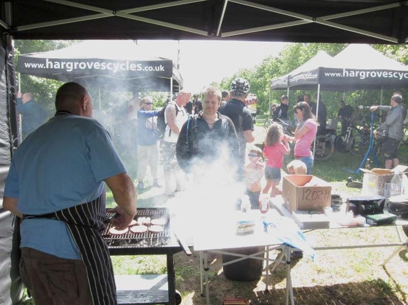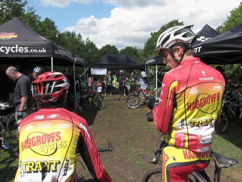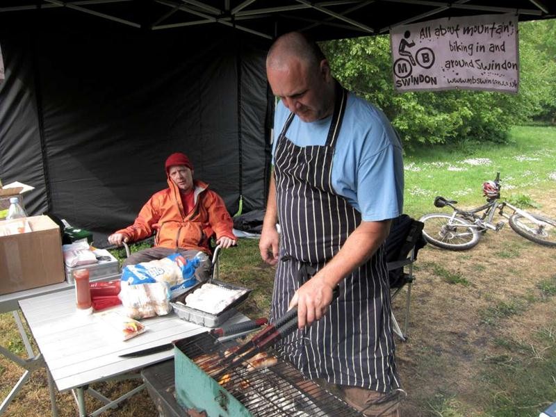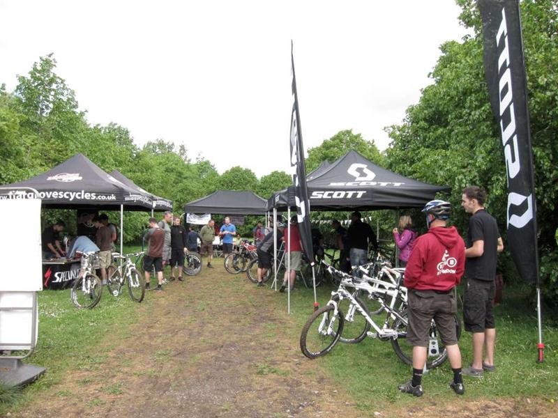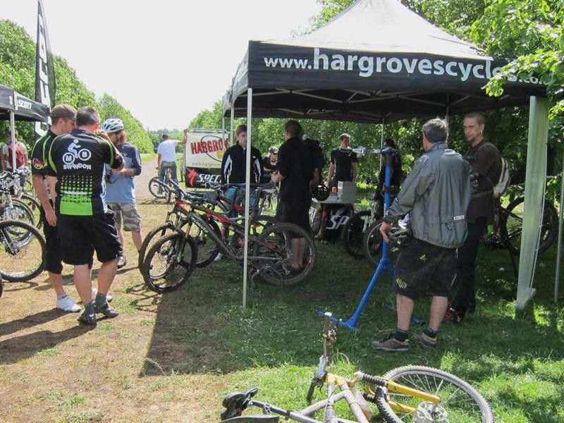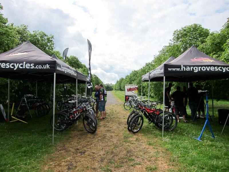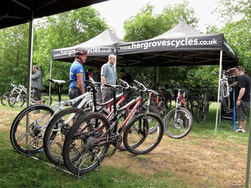 This was a mountain bike demo day organised by Hargroves Cycles and held at the Croft trail in Swindon. We’d had several dry weeks which had finally ended on the Friday night. Saturday night had seen a lot of rain too, so we were concerned that Sunday would be a wash out. It started out looking that way, but by 11am it had cleared up. We ended up with a dry day and the trail dried out quickly. There were just under 30 bikes on hand for test rides in a variety of frame sizes. See the full list at the bottom of the page. This was an opportunity to ride the trail, try some new bikes and to find out more about the club and mountain biking in the local area. MBSwindon had the club gazebo set up with a barbeque on hand. Highworth Camera club had a group of photographers around the trail capturing the action. The two guys in the red and yellow Hargroves tops are Steve James and Andy Hargroves from the Hargroves race team. I had lap round the trail just before 10am with Andy who pushed me along nicely!