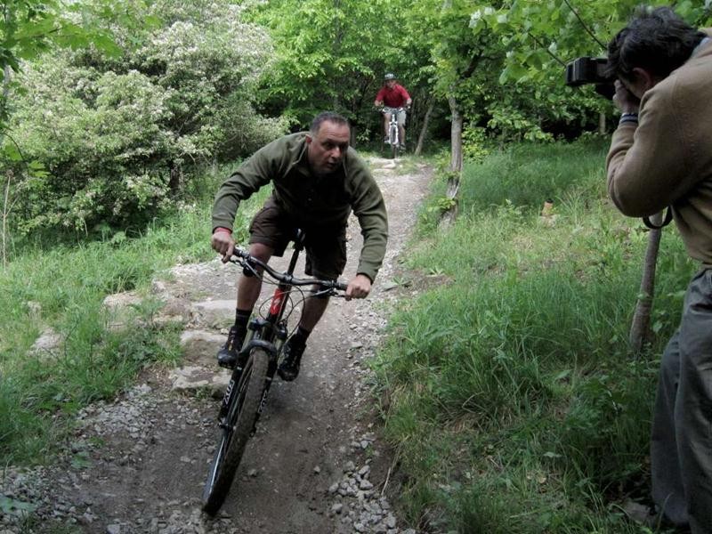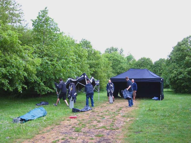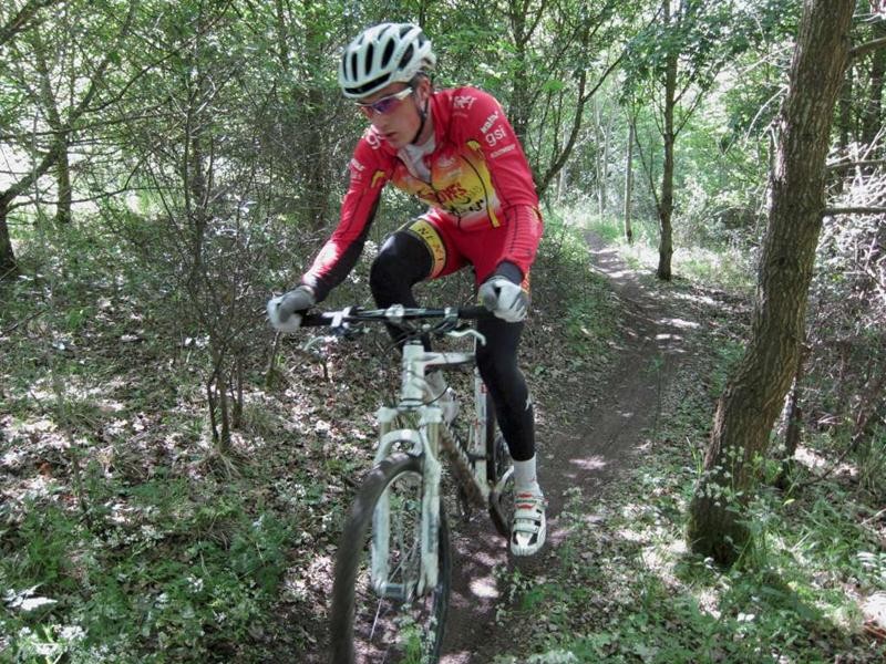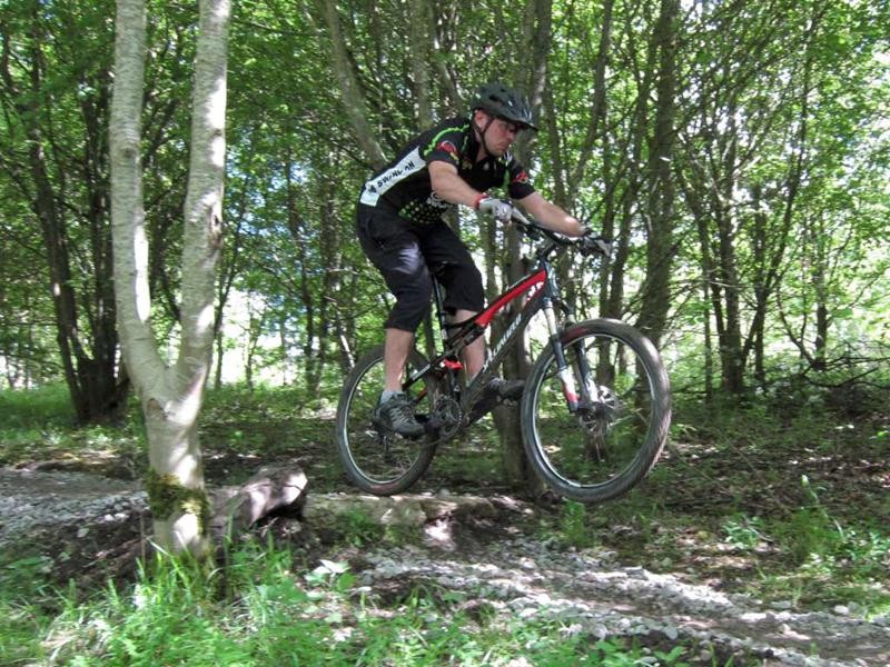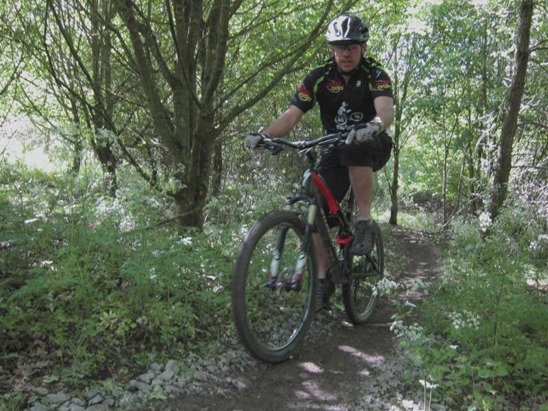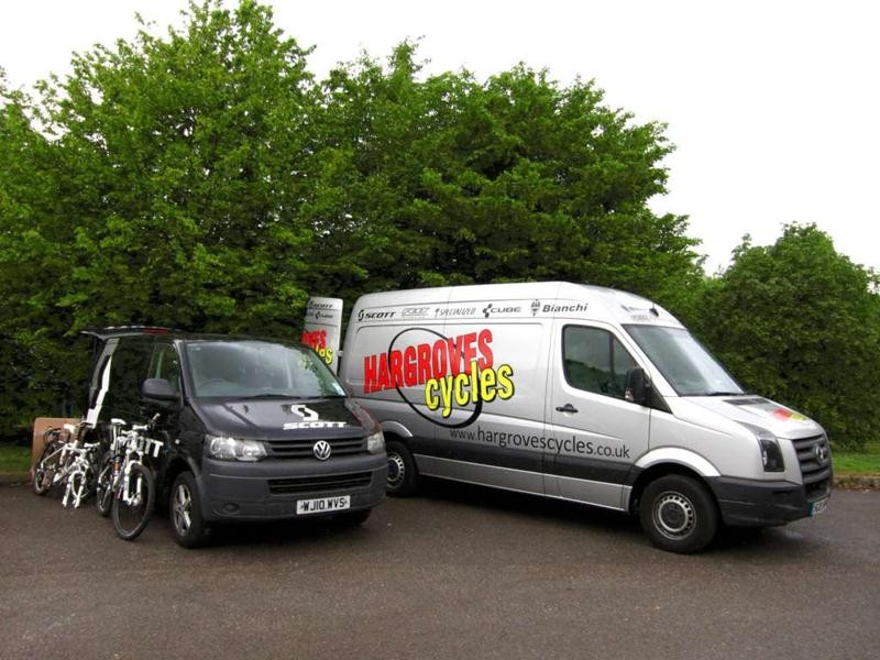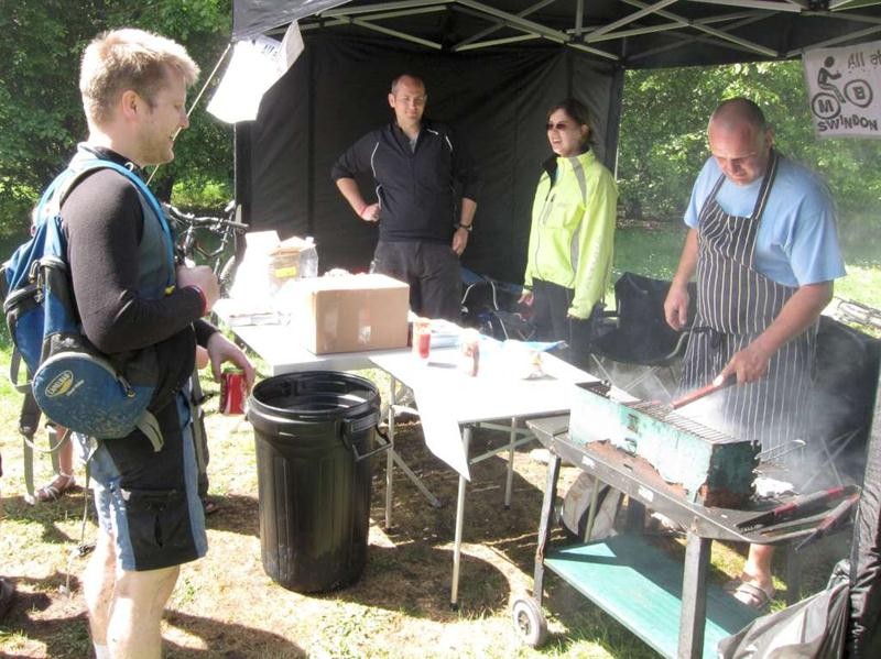 This was a mountain bike demo day organised by Hargroves Cycles and held at the Croft trail in Swindon. We’d had several dry weeks which had finally ended on the Friday night. Saturday night had seen a lot of rain too, so we were concerned that Sunday would be a wash out. It started out looking that way, but by 11am it had cleared up. We ended up with a dry day and the trail dried out quickly. There were just under 30 bikes on hand for test rides in a variety of frame sizes. See the full list at the bottom of the page. This was an opportunity to ride the trail, try some new bikes and to find out more about the club and mountain biking in the local area. MBSwindon had the club gazebo set up with a barbeque on hand. Highworth Camera club had a group of photographers around the trail capturing the action. The two guys in the red and yellow Hargroves tops are Steve James and Andy Hargroves from the Hargroves race team. I had lap round the trail just before 10am with Andy who pushed me along nicely!