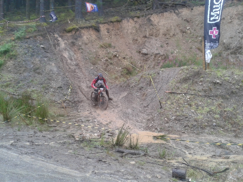 Overnight came plenty more rain. In fact the organisers decided that it was just too dangerous to run some of the stages as they were. So some changes were made, including removing the hairy drop into the quarry that was on stage 2. So with 7 stages to race (no practicing today) there was no point in hanging around as the rain was never going to stop, so you just had to get on with it. Luckily for me, we were treated to some surfaced trails on some of the stages. So for these I reverted back to standard riding style; disengage brain and wind it up to warp factor 9. I don’t have an issue with riding flat out on surfaced trails or rock based stages, even in the pouring rain. Years of riding motorbikes have probably desensitised me to speed. For the steep, tight, loamy stages I just had to keep my head on and keep it rubber side down. It’s taken me a while, but I’ve finally realised I can’t ride flat out on wet mud. So if I slow down and skip the bit where I have to get back on the bike, then I finish that bit quicker. Simple really.