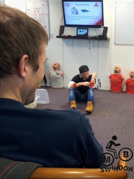 The format was a mix of presentation, demonstration, hands on trials and discussion. There were two assistants for some of the demonstrations whilst for others we had to work in pairs or groups. Our instructor Jayne had a lot of experience of providing cover at national cycling events including downhill events and road races.