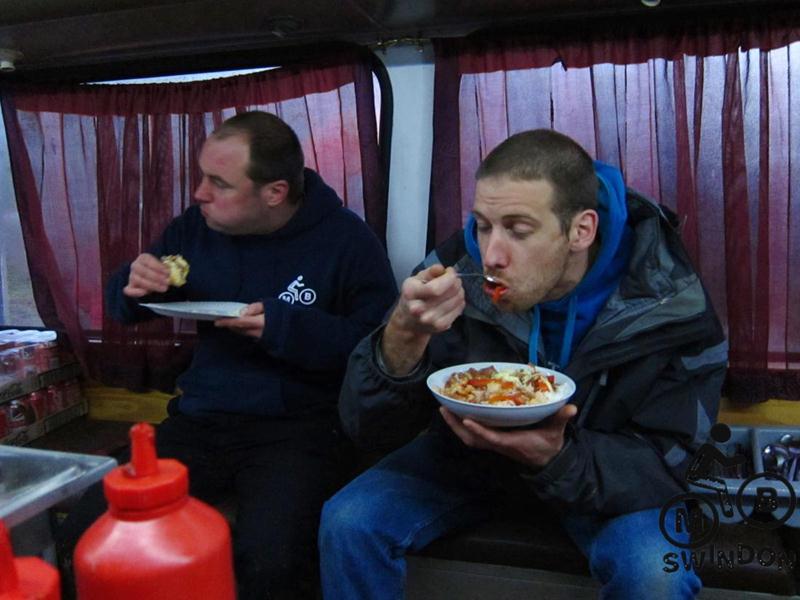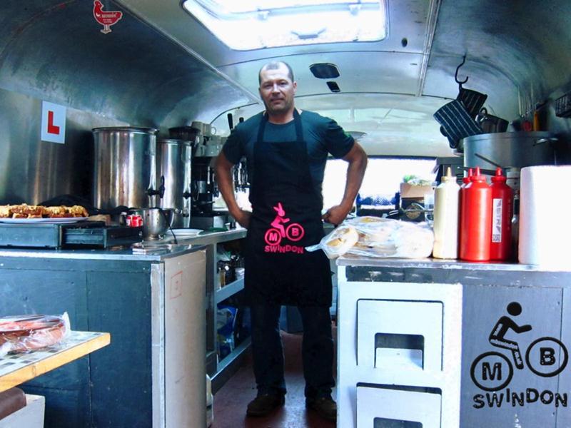 We called round to Ian Luff at the Drop Off Cafe bus to deliver a load of cheek and our present – an MBSwindon apron with bunny logo. See our shop for similar items.