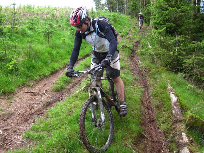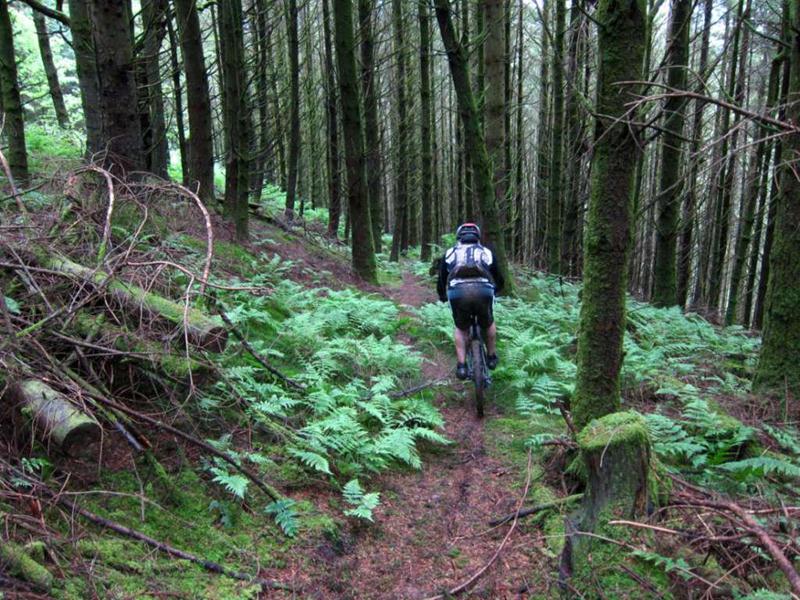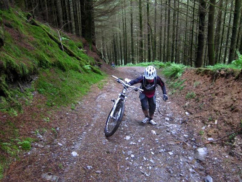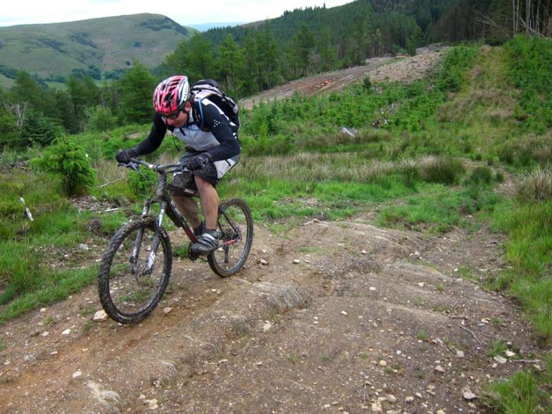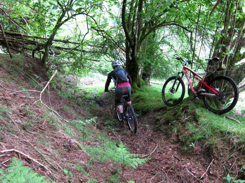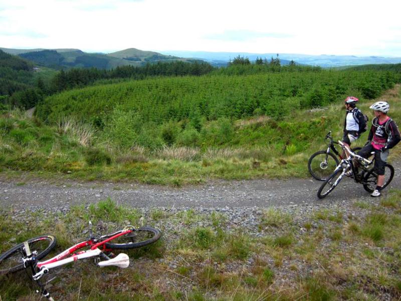 Taking this route meant that we had to ride a few sections twice which seemed to work quite well. We made a serious attempt at the steep climb near Coed Trawllym, doing it in sections and climbing all of it except about 10m. The view from the top was worth the effort. Sadly, one of the best bits of the trail had been bulldozed out of the way for a new track junction.