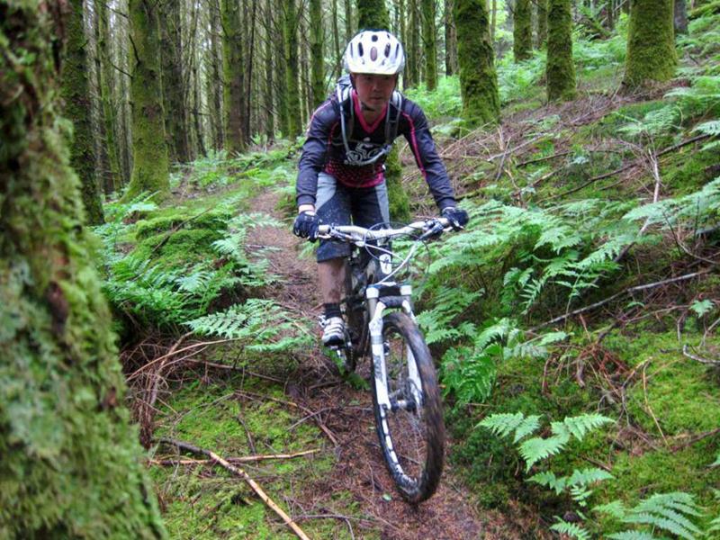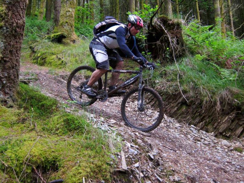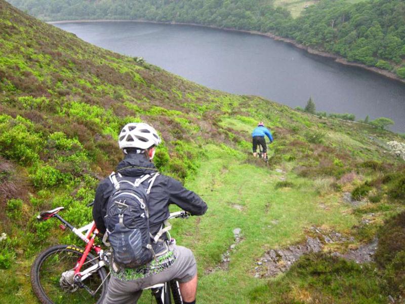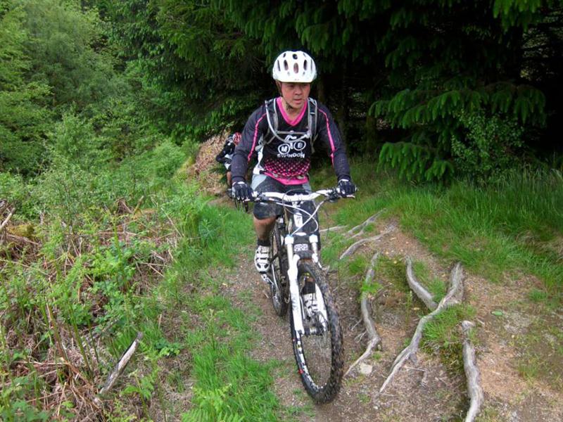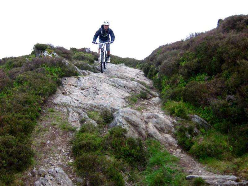 The only way from here had to be down.The downhill consisted of a series of rock steps, about twice the size of a cattle grid and between them a sloping, grassy track. This meant that speed could be maintained at all times and the rock drops were an ideal size for airtime. Neil had told us that it was good.