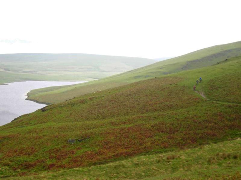 We opted to start with a climb, so parked on the outskirts of Rhayader. A light drizzle was falling as we started on the long road climb. This went on a for a while but wasn’t too steep. Eventually we turned off the road and onto a narrow path that continued to higher ground. As we reached the top then the climb turned into a traverse on bouncy grass. As we worked our way round the mountain some great views came into play.