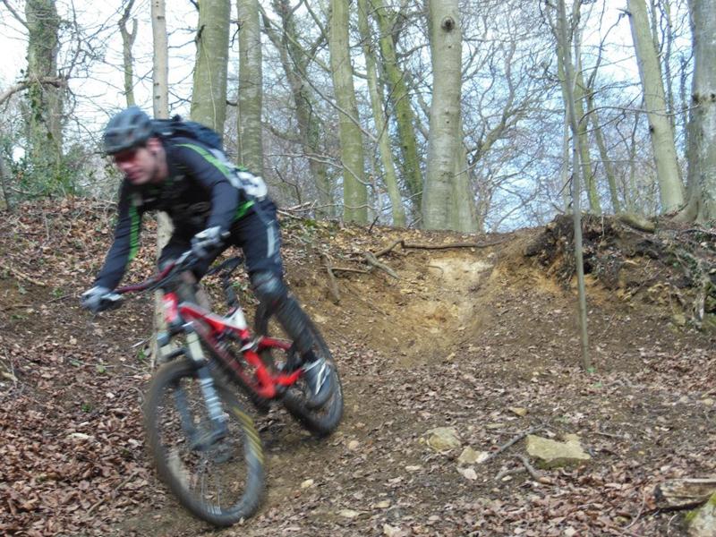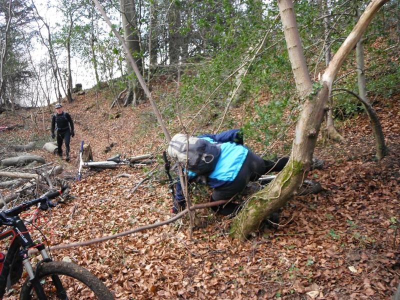 Cracking bit of downhill single track next. Sensing a good photo opportunity a few of the paparazzi took off to get themselves in a good position and this turned out to be very fruitful exercise. I take this opportunity to apologise to Paul for laughing at his misfortune, cracking bit of tree felling though and to Tom for riding down there on his front wheel, pure skills.Â