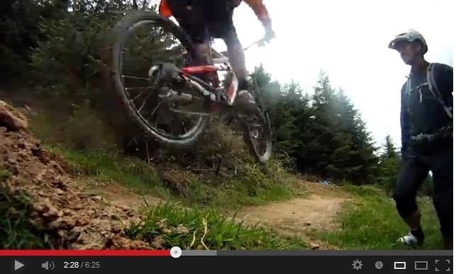 The DH tracks offer many lines through the woods on the side of a steep valley. We started on a very gnarly track which turned steep and loose towards the end. Most of us wimped out. Gary Lee and Robin showed how it was done. After a long climb back tot he top we took a much smoother trail which lead to a lot of jumps. We spent half an hour trying out the various jumps before continuing down the trail and then back up. We repeated this pattern several times, spending a few hours trying out various options.Â