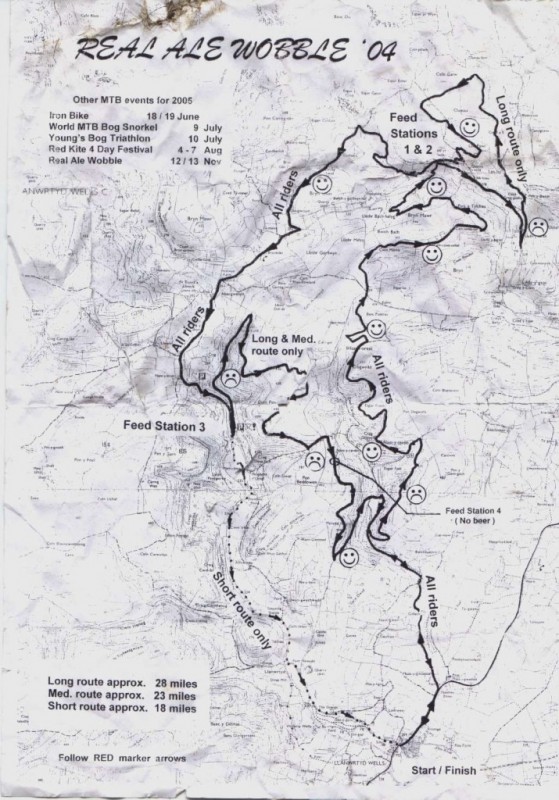 In the early 2000’s the route went out to the LLyn Brianne reservoir. The route was pretty much the same for a few years. In 2002 the woods down to the Trallwyn control were avoided with a short cut over the hills. A feature of these early rides was the “transport museum”; a collection of rusty buses on the hillside before the Trallwyn control. By the late 2000s these had gone and had been replaced with a house. In 2004 there were major changes when the the reservoir loop was dropped as the trail centre at Coed Trallwmwas opened. I’ve never thought much of the trails there – they need surfacing and more development. In 2004 the first part of the route moved from the bottom of the valley and used a stinging climb up through the trees. This gave a good downhill section on rocks. The position of the last beer stop moved in 2004. Before then it was up a short climb from the road. It was now in the car park by the bridge over the river. Looking at my old maps it looks like the “sheep dip” section was not used before 2004. This is the secion with numerous rock puddle, the deepest of which is up to the middle of the wheels. This section has been used in ever route since 2004. Rightly so, since it’s a great bit of riding. Prior to 2004 the the Sunday route was the Saturday route ridden the other way round. From 2004 the route was the same both days. In 2005 the route start and finish moved from the square outside the Neudd Arms hotel to the local school. The “proper” wobble always started with Gordon Green giving a safety lecture outside the hotel. There were changes in 2007 when the route started off up the road, did what was normally the last section first, then had a steeper descent down in one of the main valleys. This was followed by descent over the open hills into the Abergwesyn valley. It also had an out and back loop near Llanwrtyd Wells. This route used a lot more road than usual. The Sunday route had a completely different start – going towards the Woolen mill and then joining back onto the Saturday route. 2008 and 2009 were back to the 2004 model but with slight differences in the trail sections used at Coed Trallwyn. 2010 was a new, shorter route with the trail centre not included. If you are going to the event then book accomodation as early as possible because everything sells out. See Google maps accommodation link and Llanwrtyd Wells Tourist Information for more information. |