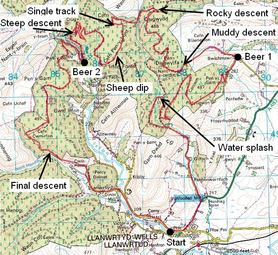There were changes in 2007 when the route started off up the road, did what was normally the last section first, then had a steeper descent down in one of the main valleys. This was followed by descent over the open hills into the Abergwesyn valley. It also had an out and back loop near Llanwrtyd Wells. This route used a lot more road than usual.