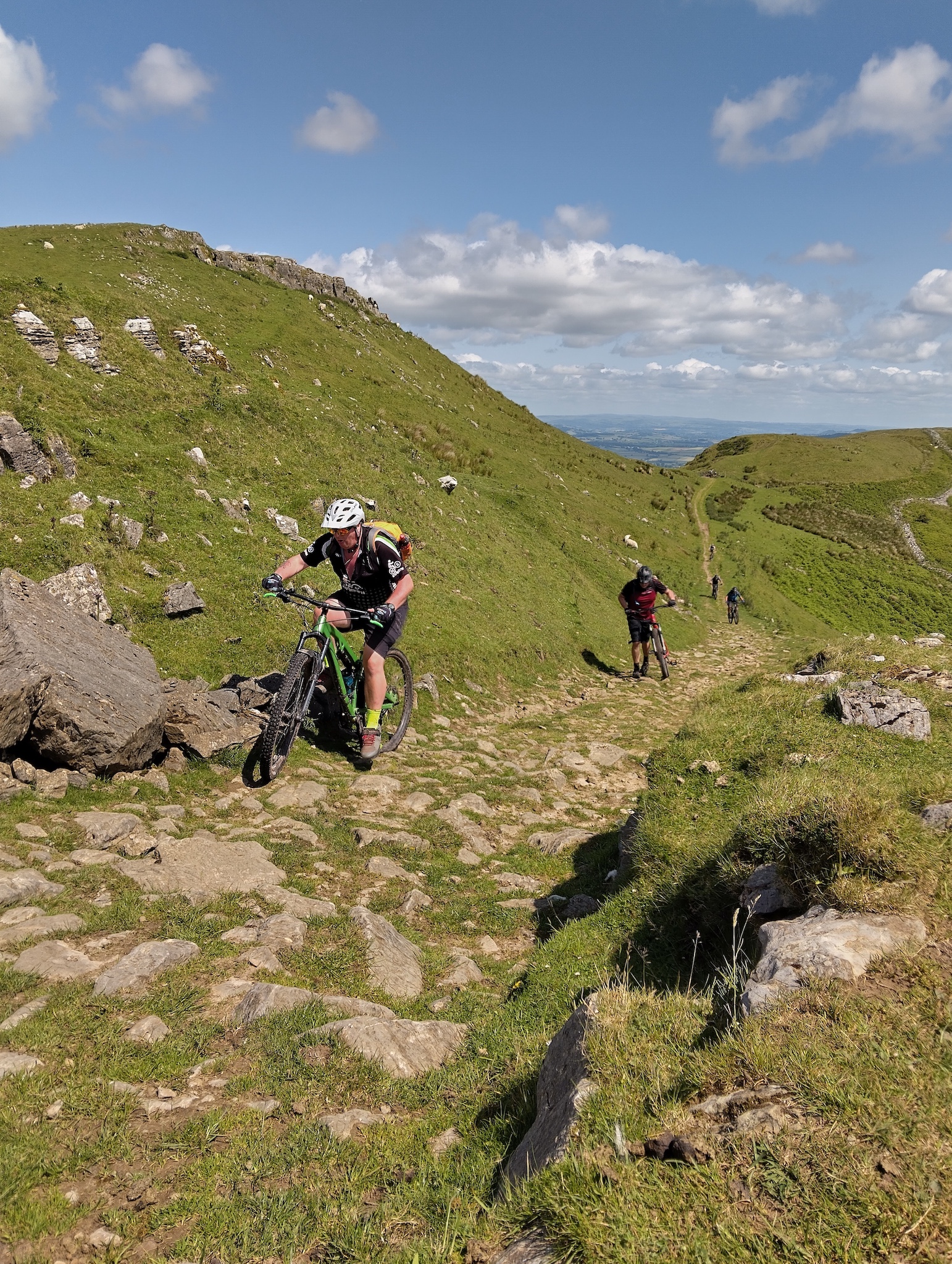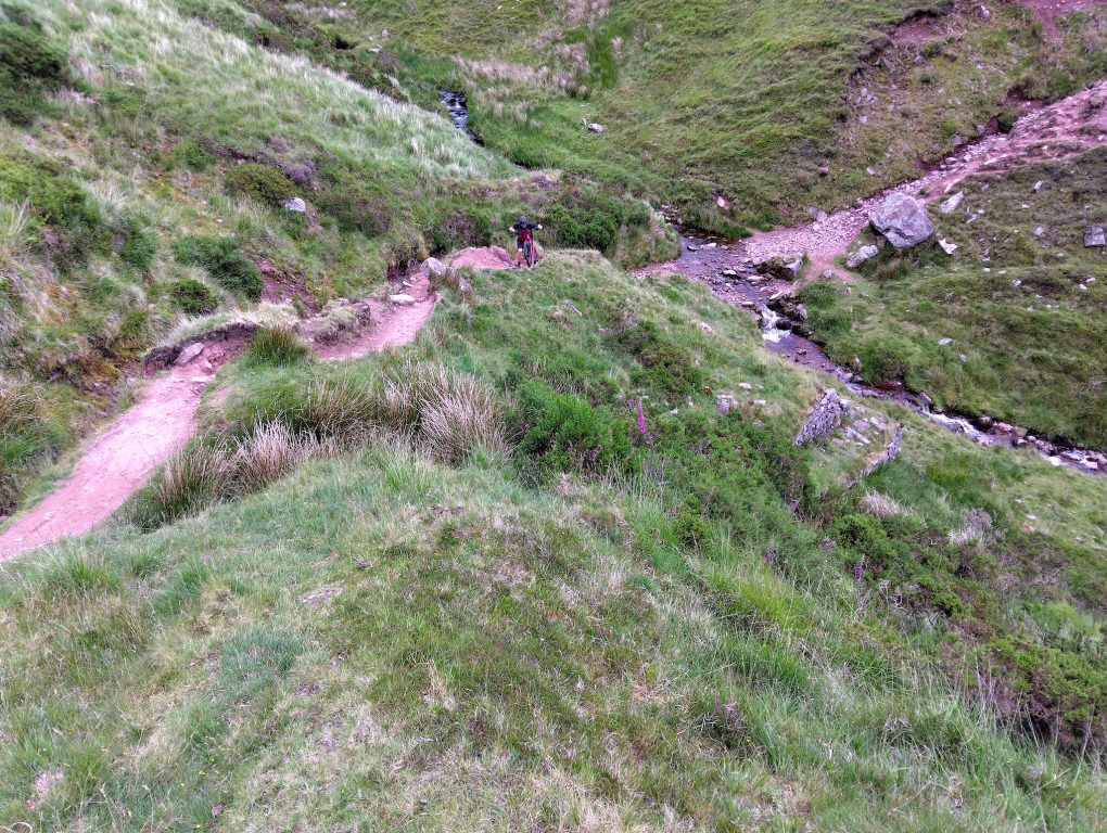 The descent from the Gap is very long, and covers all sorts of terrain, from bouncing over large stones to speeding along grassy sections. This is just as demanding as the climb, and we stopped a couple of times to regroup on the way down.
