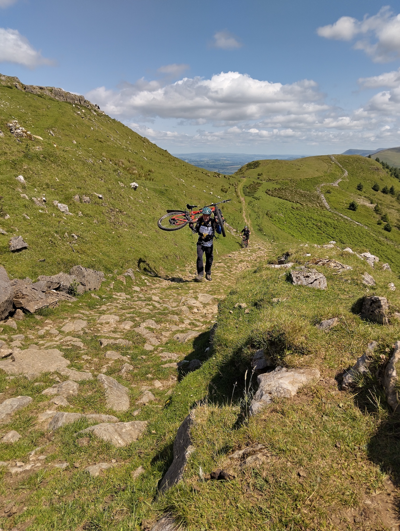 After stopping for a bite to eat, it was back uphill again, including one section where we all ended up doing a bit pushing and carrying. Again, though, the effort was worth it as we enjoyed the views and the twisting descents. The forecast for the weekend had been lots of rain, but despite the clouds, we ended up having an almost entirely dry day. Then it was back to the Bunkhouse to wash the bikes and prepare for a pub meal and a drink or two.