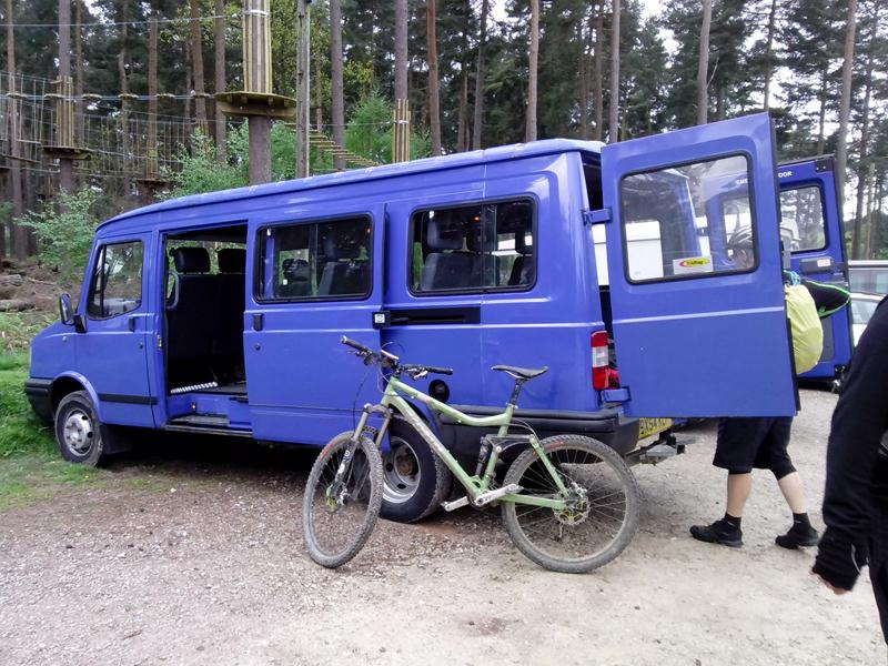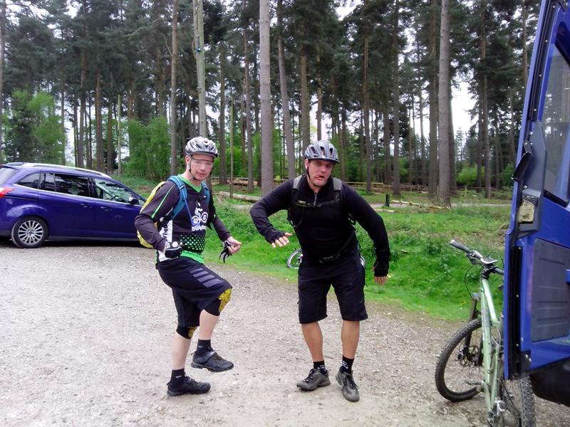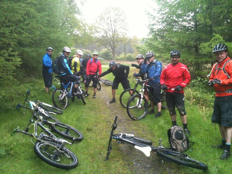 We arrived at Cannock Chase following an uneventful drive in the Big Blue Bus. The weather on the way up had been glorious sunshine so we were expecting a nice dry day… We met up at the Birches Valley Forest Centre, home of Cannock Chase MTB trails as well as a host of other activities (worth a visit even if you don’t take the bike!) and were greeted by local reprobates Paul Broadrick and Tony Holmes, and Paul’s riding buddies Carl (leader) and Steve and with 9 (including Deano who decided to drive up having changed his mind a few times) of us from Swindon that made 13, which is a good turnout for a wet ride 100 miles from home! The ride was great, a real workout, the mud was more like muddy water in small puddles so didn’t really slow us down too much. The weather was 80% decent and 20% atrocious. There were several sections where the track was a series of dips and rollers which fitted exactly the wheelbase of a 26″ MTB so you couldn’t really get any speed up, but that, and avoiding overhead branches and ‘gnarly’ roots was part of the fun… There were also a few drop offs and little bomb holes and rooty downhill sections which caught a few of us out… There were a couple of minor offs along with two more serious spills of note.