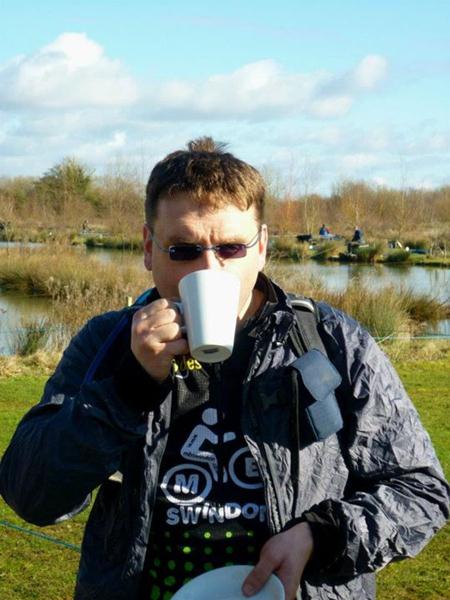 Drinking mug of tea at Cotswold Water Park.