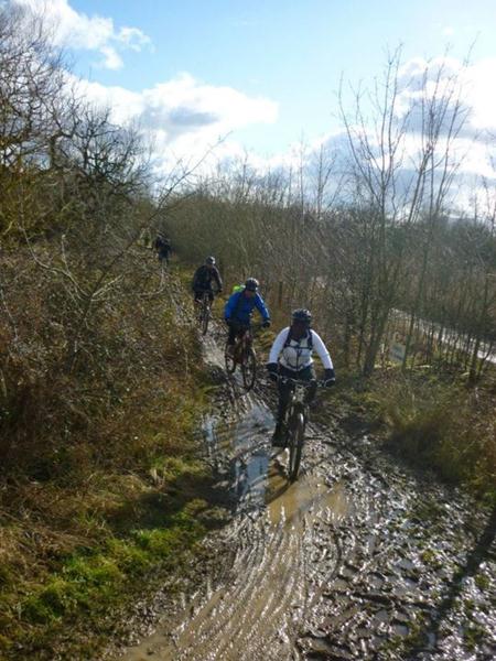 The return journey had us cycling on quiet rural lanes for a while before turning onto a bridleway around the lakes near Waterhay. These tracks were muddy in places and it was clear to see that this area is quite popular with cyclists.