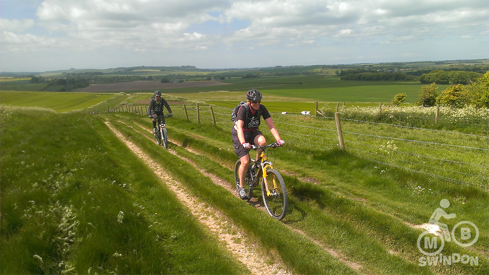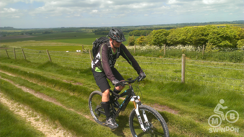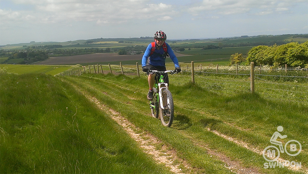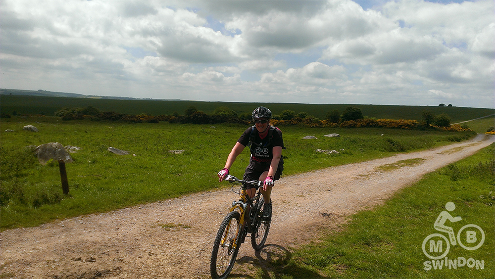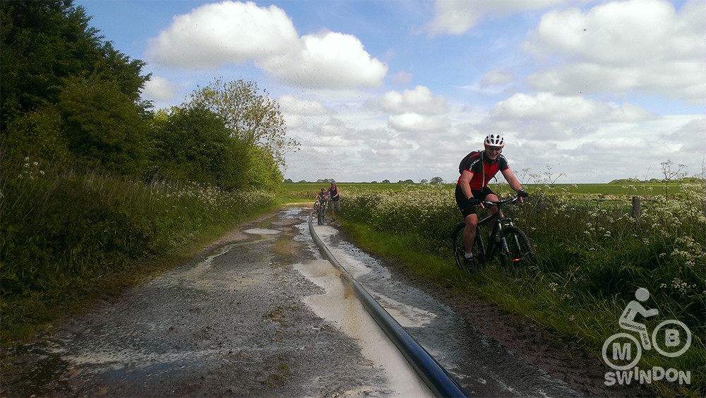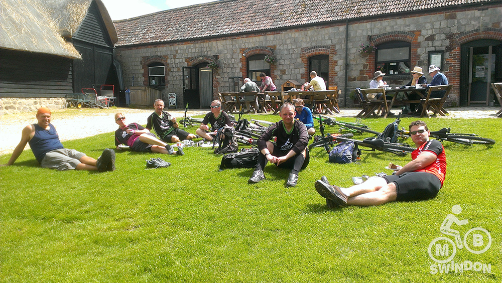 Blessed with a beautiful sunny day, we navigated the fallen branches and debris along the bridleways, through some very ‘pedally’ and energy sapping sections towards Broad Hinton. With the tracks being very dry and bumpy from lots of use by horse riders, the going was quite tough on this early section. I took the decision to allow the group a short rest (using the excuse of needing to ride ahead looking for the next gate to make sure that I hadn’t missed a turn!).