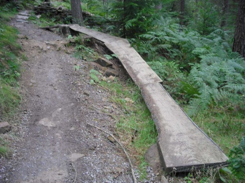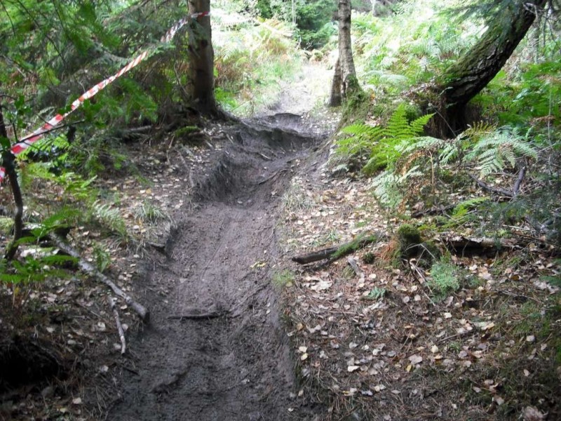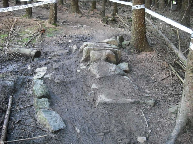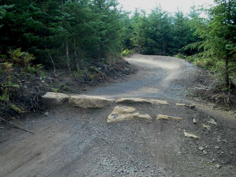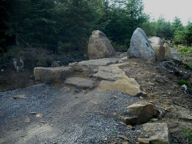 Rocks on MTB track.I started out by following the Red trail. This follows a wide path from the car park and not much happens for the first mile or so. After crossing the road it was a big climb up a track. This passes through the Descend Hamsterley downhill area. There were a lot of riders on the trails there. The next signpost gave me the option of the Section 13 extension. This involved more climbing up a track. It was well worth it though: Section 13 is a brilliant bit of flowing downhill with a lot of rock jumps, kickers, berms, a corkscrew and some tabletops. I liked it so much that I did it four times. The Hamsterly Trailblazers are a local club dedicated to improving the trails in the forest and this is one of their initiatives.