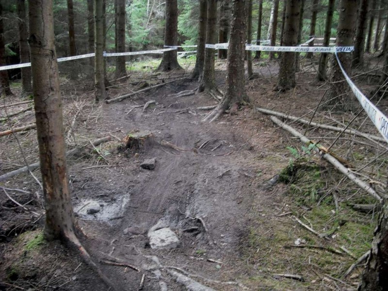 Large track at Hamsterley.After Section 13 I was in a good mood and prepared to accept a bit of boring trail. After several kilometres of wide track I wasn’t so happy. Fire road heaven. The view was alright though. I was riding along thinking “a bad day riding is still better than an excellent day in the office” when I encountered race marshalls. They were running a 121 race. This means 1 bike, 2 events, 1 rider. They were using the Transmission Line section plus some custom trails. I followed all of this to the race finish. The Transmission Line section is similar to Seection 13, meaning flowing trail with large berms, optional rock features, kickers, table tops and jumps. The race route had a really tight section through the trees over roots too.