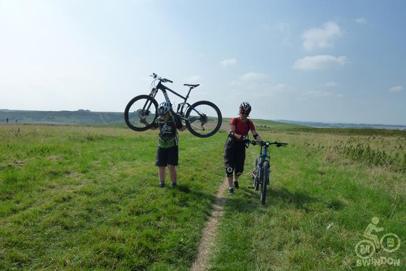 The steepest hill of the ride came at this point and it was a challenge to see who could reach the top still riding. I hadn’t mentioned the fact that the route climbed all the way home and there was more to come. The next hill, up the grass side of Barbury Castle, was where we had our one and only mechanical failure and left Sharon with a non playing bike. Sarah to the rescue with some ‘out of the box’ thinking and we made our slow way back across the last field to the cars and another bit of cake . I did say ‘there may be cake’!