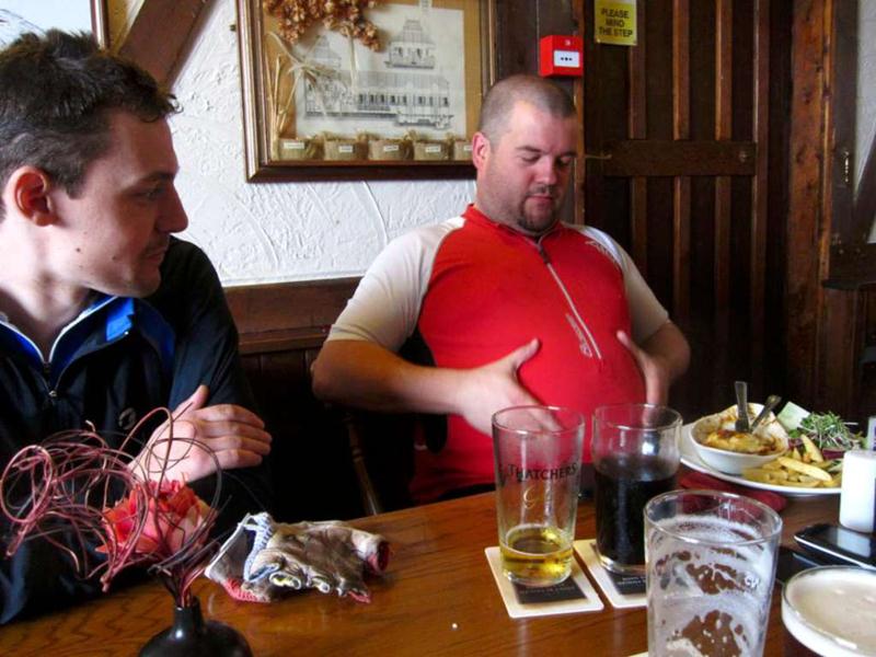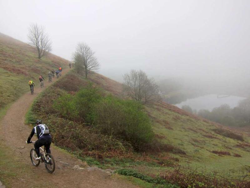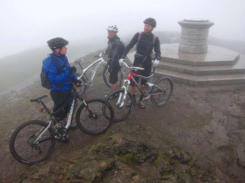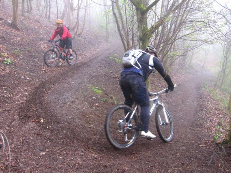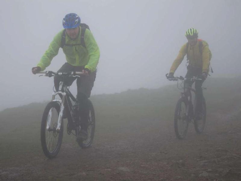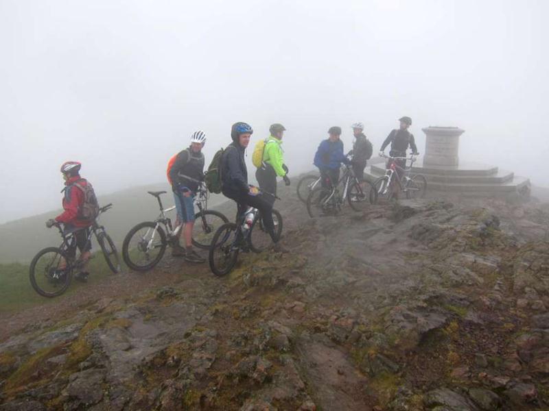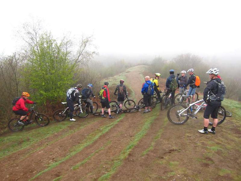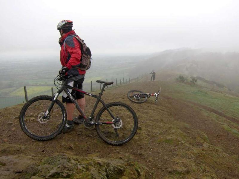 Suitably refreshed we set off again in the mist only to stop for the inevitable punctures. Eventually a somewhat indirect route led us to the top of the Worcestershire Beacon, normally an excellent viewpoint; but not today. It was decided that the best descent off the Beacon was just a bit too iffy in thick mist as the cyclist/walker interface could well have caused problems. We therefore reversed our route up and rode a circuit of North Hill instead. At this point Gary Palmer had another incident which involved his carbon frame and also took a wrong turn in the mist ending up in Malvern on the wrong side of the Hills for a return to Ledbury. He opted to ride back along the road with his poorly bike. “MBSwindon broke my bike!”