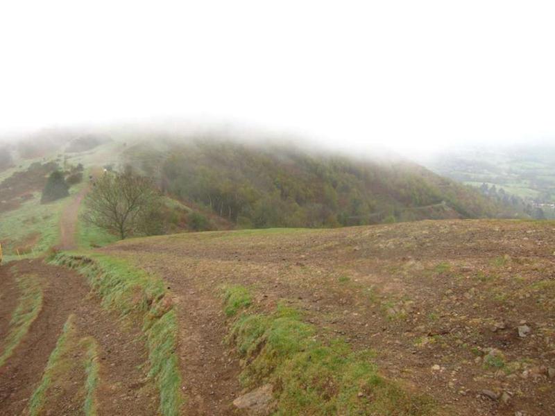 We set off at 10:30 from the centre of Ledbury in clear weather and we followed a short stretch of road out of town beofre turning onto our first climb of the day. This went up a track then down over a bit of rooty singletrack. A gate at the bottom led to the start of another climb, this time up a damp field and here the weather changed – drizzle with heavier bursts of rain a bit of mist to add to the fun.
