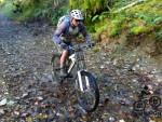 The route now craftily joined onto the Gorlech trail. Ingenious use of  a bridleway meant that we started right next to the end of a section of trail, crossed over it, then crossed a rive via a big ford before finally coming out at an earlier point on the Gorlech trail. We followed the climb up before nipping off the trail to use a bonus section that had also featured in the Brechfa Frostbite in January 2012. The steepest section was also the muddiest and Phil boldly rode down this and then fell off at the bottom. A strap on his rucksack caught on a tree and stopped him from going face first down more of the hill (photo).