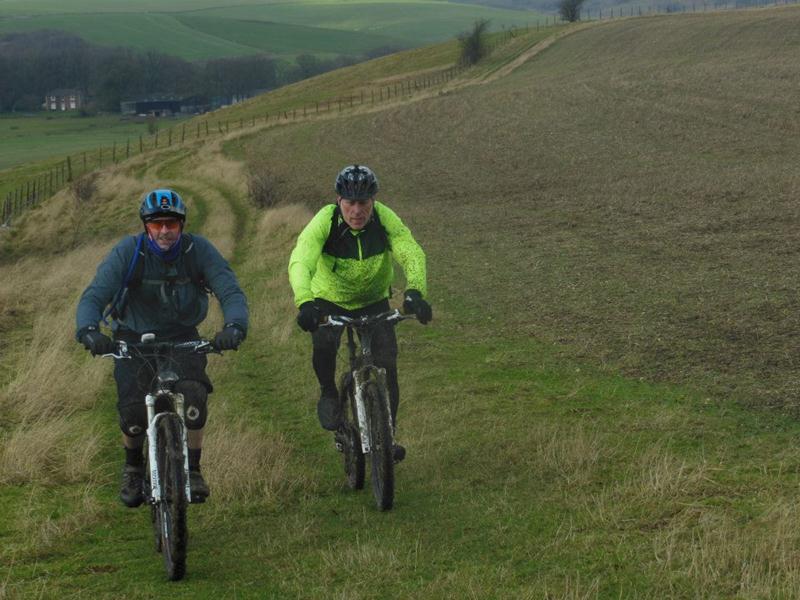 Having got to the ridge line we took the Ridgeway towards Liddington hill. The wet ground and grass made the climb up Liddington hill tough. Our reward was a fun descent down the other side of the hill. All safely down we crossed the road and took the bridleway along the hill line climbing towards Sugar Hill. Watching a bird of prey (a hawk I think) hunting in the nearby field took my mind off the leg sapping wet ground under tyre. We continued on from Sugar Hill past the ancient barrows. From there we took the fun and slightly slippery descent into Aldbourne, with the braver amongst us taking the optional jump half way down.