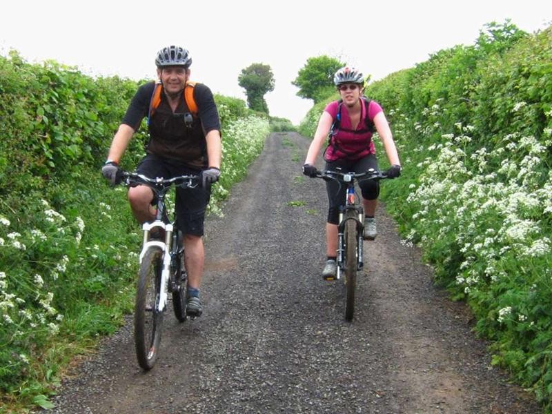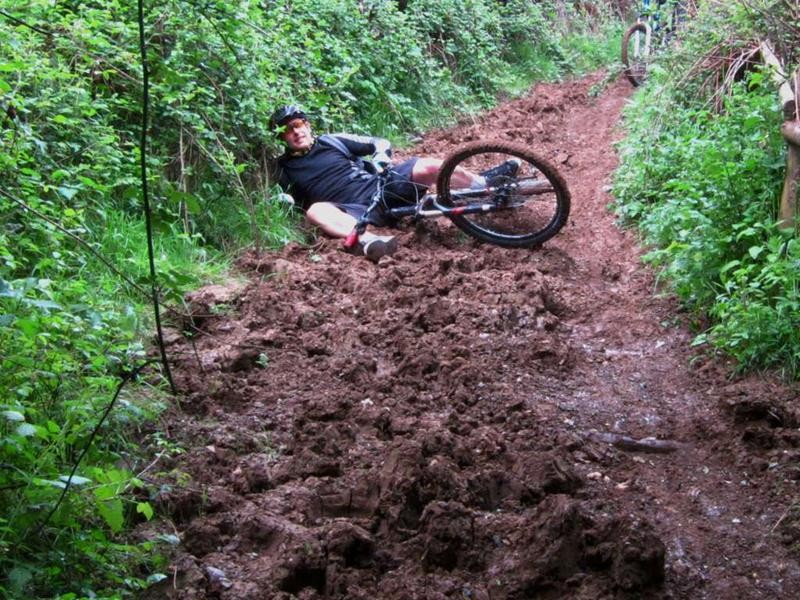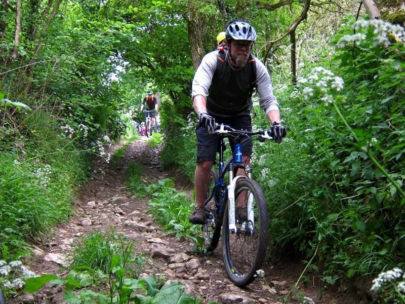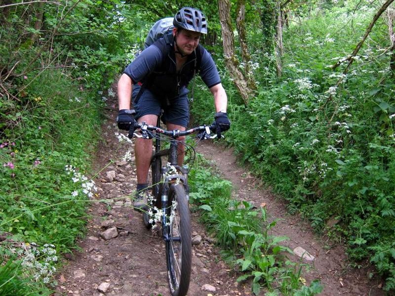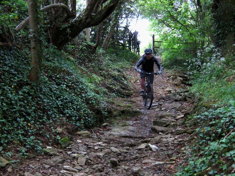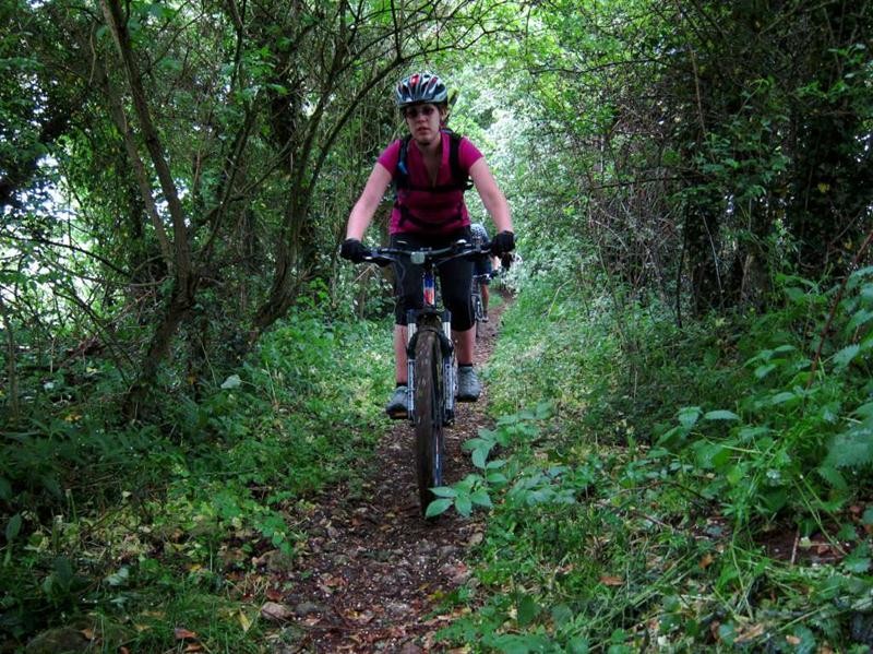 Due to the quirkiness of this route another half hour’s riding and another puncture brought us to within touching distance of where we’d already ridden and only five minutes away from the lunch stop pub. Tempting as the cider was we carried on down a fast, stepped farm track that got narrower, faster, rockier and steppier as it went down. Kat and Sharon opted to take the easier diversion and met up with us about 100 metres further on.