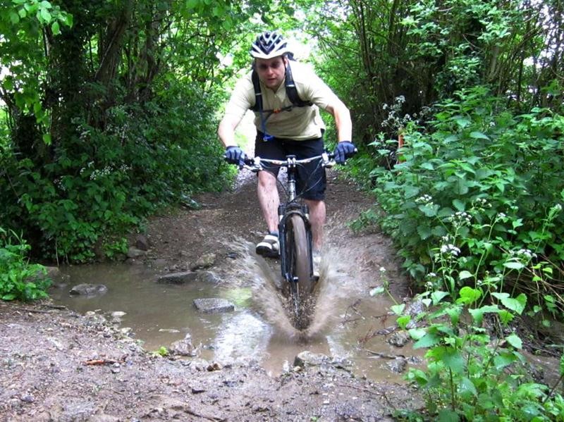A short tarmac stretch then sends you down the second off road descent. This was slippery enough to have Rich riding part of it sideways. There’s a refreshing water splash at the bottom and then you’re straight into another climb.